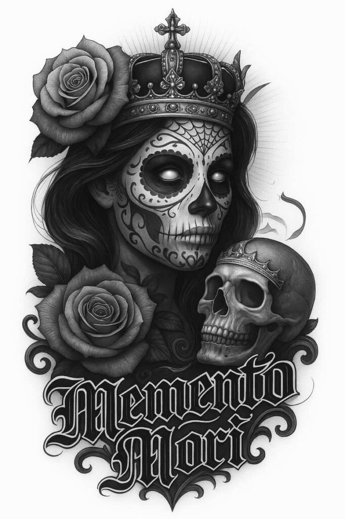 This is an AI-generated tattoo project in black and grey, featuring a crowned woman with Day of the Dead sugar skull makeup, roses, and a skull. The composition blends realism with ornamental patterning: a lace-like web across the forehead, decorative swirls along the cheeks, bold shading to sculpt the jaw, and two roses framing the portrait. A skull with a crown rests beside the woman, reinforcing the Memento Mori theme that mortality and memory endure. The typography at the bottom gives Gothic flourishes that can be adapted into a custom tattoo design. Although AI-generated, the piece demonstrates professional balance, with crisp line work and smooth gradients that translate well into skin. The piece speaks to themes of remembrance and impermanence, while offering a versatile canvas for tattoo enthusiasts seeking meaningful tattoos or rose tattoo design motifs. For artists, this design serves as a study in black and grey realism and pattern work, with fine line detailing suitable for small tattoos or a larger back or chest piece. The roses provide natural contrast to the skulls, and the crown anchors the composition with a regal feel. In practical terms, the high-contrast shading and dense negative space make it an excellent candidate for a cover-up, capable of concealing older ink while delivering a striking new body art statement. This design integrates several SEO-friendly concepts—tattoo, tattoo design, meaningful tattoos, fine line tattoo, rose tattoo design, black and grey, realistic tattoo, and ink—while preserving the elegance of a timeless Memento Mori motif that can be personalized through color accents or precise symbol choices. AI-generated tattoo projects like this illustrate how classic motifs can be reimagined for contemporary body art, offering a template for tattoo practitioners and clients alike.