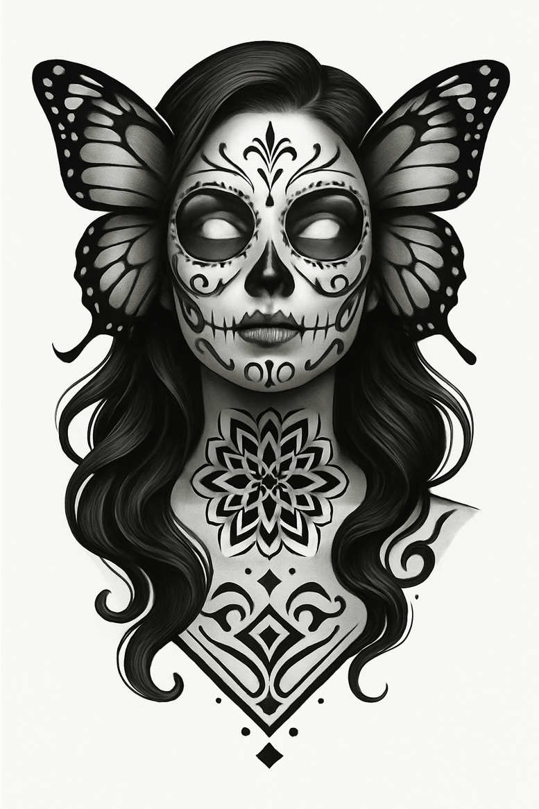 This is an AI-generated tattoo project exploring a high-contrast black and grey composition that merges Day of the Dead sugar skull iconography with butterfly symbolism and geometric mandala detailing. The central figure is a woman’s head rendered with delicate shading to imply depth while preserving a graphic, tattoo-friendly silhouette. The eye sockets and decorative lines evoke a sugar skull aesthetic, with the forehead and cheeks adorned by curvilinear motifs that read as intricate patterns rather than solid fill. Framing the face, butterfly wings extend outward, their wing venation and stippling harmonizing with the hair silhouette to create a symmetrical, dynamic balance. A prominent mandala motif sits at the neck, expanding into an ornate chest- or shoulder-down composition that invites the eye to travel along repeating geometric petals and diamond shapes. The overall design leans heavily on pattern work; the repetition and rhythm of the motifs reinforce a cohesive narrative that translates well to larger canvases or as a bold standalone piece. As an AI-generated concept, this tattoo design demonstrates how algorithmic creativity can inspire meaningful tattoos that pair transformation (butterfly) with memory (sugar skull) and spiritual symmetry (mandala). The piece naturally accommodates fine line tattoo techniques and smooth gradient shading, offering a realistic feel within a black and grey palette that suits body art lovers seeking a strong, timeless tattoo. It also nods to Japanese style sensibilities through disciplined line control and a balanced composition, while remaining adaptable for rose tattoo design or lotus flower tattoo ideas in future iterations. Though generated by AI, the concept invites collaboration with a tattoo artist to refine line weight, spacing, and placement for a personalized, custom tattoo design that remains a statement of meaning and artistry in ink.