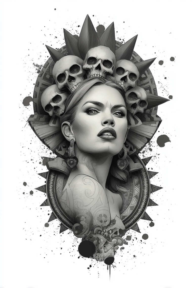 This AI-generated tattoo project merges classical portraiture with macabre symbolism to yield a bold black and grey tattoo design that is ideal for a cover-up. The centerpiece is a woman’s face rendered in refined line work and smooth shading, while a crown formed by skulls sits atop her head. A circular, mandala-like frame provides rhythm through geometric patterning and serrated edges, and ink splatters anchor the composition in the white negative space, giving motion and modern edge. A shoulder tattoo motif echoes the neck and arm lines, reinforcing unity across the piece. The design relies on black and grey tonal ranges to create depth and texture, with deep blacks and mid tones ensuring readability at distance and rich detail up close. It sits within fine line tattoo traditions, yet its bold silhouette and graphic geometry push toward a contemporary fusion that can be adapted for Japanese style or tribal twists if desired. Symbolically, the skulls express mortality and courage, the circle hints at cycles and protection, and the woman’s gaze invites introspection. The piece is clearly suitable as a cover-up due to its dark palette and vertical flow that can mask older work while preserving elegance. As an AI-generated tattoo concept, it demonstrates how digital design can translate into meaningful body art and offers a striking reference for clients seeking black and grey ink with intricate pattern work. Keywords such as tattoo, tattoo design, meaningful tattoos, fine line tattoo, lotus flower tattoo, infinity tattoo, tribal tattoo, rose tattoo design, small tattoos, flower tattoos, custom tattoo design, Japanese style tattoo, black and grey, realistic tattoo, body art, ink pepper the prose to support visibility and discovery.