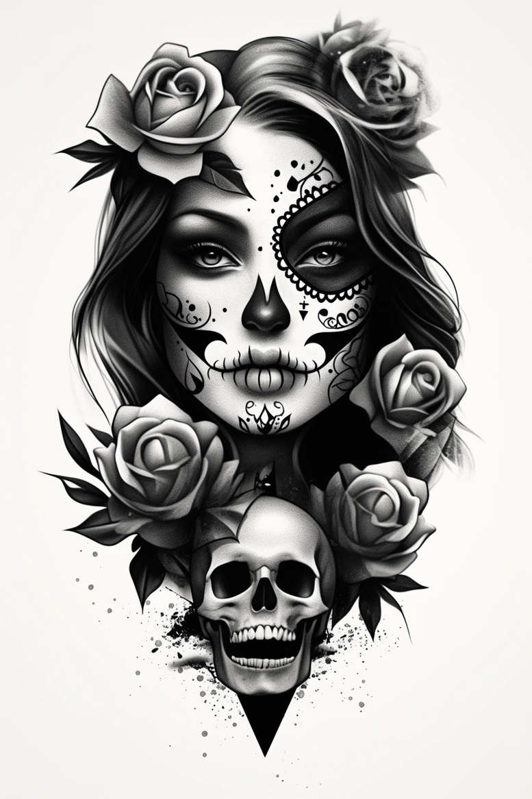 This image translates into a compelling tattoo design concept: a grayscale portrait that fuses a feminine face with Día de los Muertos sugar skull motifs, framed by roses and anchored by a skull at the chin. The facial features are rendered with soft gradients and precise line work that achieves a realistic black and grey look while preserving bold contrasts that read clearly at arm or chest scale. Intricate sugar skull patterns spread across the forehead and eye sockets, composed of lace-like swirls, dots, and cut-out arches that create a graphic pattern without sacrificing legibility over time. Surrounding the central figure, large roses with shaded petals provide a natural counterweight, their edges crisp against the skin while the lower skull introduces a macabre counterpoint—an emblematic balance between life and death. The overall composition exploits negative space to keep the design readable on smaller canvases, yet it remains dramatic enough for larger body art projects. The technique blends elements of realism with graphic ornamentation, characteristic of a modern black and grey tattoo style, while nodding to Japanese and tribal influences in the rhythm of lines and the arrangement of motifs. The incorporation of pattern is deliberate, making this a strong candidate for a cover-to-cover sleeve or a prominent chest panel. For the reader seeking meaningful tattoos and a statement piece, this concept offers a versatile option: a rose tattoo design intertwined with skull symbolism, executed in fine line precision, capable of translating into small tattoos or expansive compositions. These AI-generated tattoo projects emphasize clean transferability, crisp shading, and durable black ink that remains legible with aging. In short, this design is a modern classic rendered with care for balance, proportion, and timeless ink.