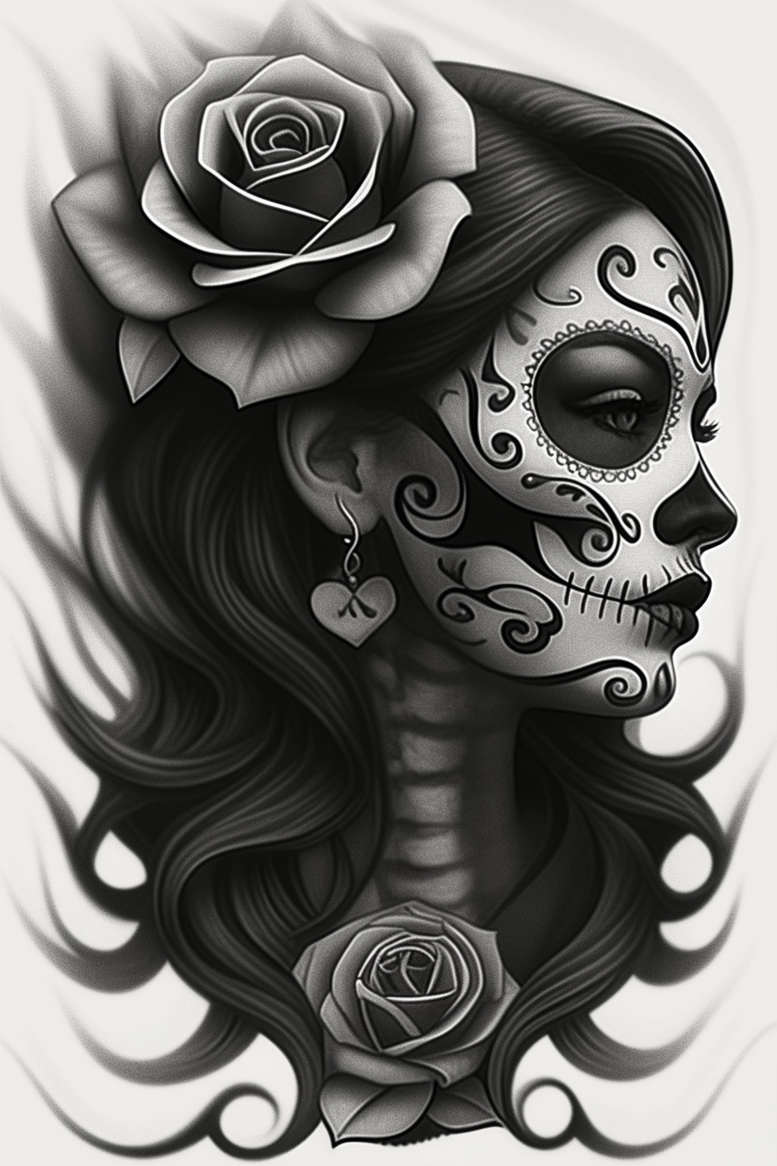 AI-generated tattoo projects present a sugar skull inspired portrait rendered in grayscale, fusing Dia de los Muertos iconography with floral motif. The design centers on a female profile in black and grey shading, with decorative swirls that frame the eye and mouth, and a stitched-lip pattern that recalls traditional sugar skull artistry. A large rose crowns the hair and another rose sits at the base of the neck, while a heart-shaped earring adds a delicate accent to the composition. The artist uses smooth gradient blending, bold contour lines, and stippled shading to create depth and a lifelike bone structure beneath the skin, achieving a balance between realism and stylization. This tattoo design conveys themes of remembrance, beauty, and resilience, making it a meaningful tattoo choice for those seeking a feminine yet dramatic statement. Keywords such as tattoo, tattoo design, meaningful tattoos, fine line tattoo, lotus flower tattoo, infinity tattoo, tribal tattoo, rose tattoo design, small tattoos, flower tattoos, custom tattoo design, Japanese style tattoo, black and grey, realistic tattoo, body art, ink are woven throughout to support discovery and SEO. Because the image is dark and heavily shaded, it is especially suitable for a cover-up, offering substantial coverage and a cohesive grayscale look that can obscure an older, unwanted tattoo while preserving an elegant silhouette. The piece can be adapted for different placements, from shoulder to collarbone, aligning with current trends in fine line and realistic black and grey tattoo artistry and presenting a compelling option for both new and cover-up clientele. Note: These are AI-generated tattoo projects exploring how machine-assisted design translates into a wearable centerpiece.