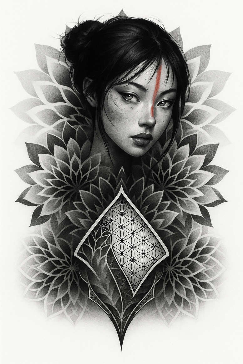 An AI-generated tattoo project presents a grayscale portrait of a woman anchored by a sweeping geometry of lotus-petal mandalas and a central diamond shield. The design blends a realistic, softly shaded female visage with high-contrast black ink for the eyes, lips, and hair, while layers of petals radiate outward in a hypnotic pattern. The diamond core is filled with a geometric lattice reminiscent of the Flower of Life motif, reinforcing balance, harmony, and cyclical life. The composition reads as a body art piece suited for placement on the upper back, chest, or shoulder depending on client preference. Fine-line detailing and subtle gradient shading create tactile depth while preserving a cohesive black and grey aesthetic. A single red stroke across the forehead provides a focal accent that can symbolize focus, awakening, or personal meaning. The surrounding petals form a mandala-like aura, symbolizing protection, renewal, and inner peace. The motif blends floral symbolism with geometric precision, appealing to those seeking a lotus flower tattoo or a flower tattoo design with a modern twist. It suits standalone sessions or larger, custom tattoo design projects, especially for wearers who appreciate subtle Japanese-inspired geometry adapted into a contemporary composition. The grayscale palette emphasizes silhouette and shading, enabling flexible placement and a timeless black and grey look. The dense blacks offer strong cover-up potential, making this design ideal for clients seeking a transformative cover-up while preserving an intricate, refined image. As an AI-generated tattoo project, it showcases current trends in fine-line work and pattern-rich ink that works well as small tattoos or as a bold statement when expanded. In short, this concept blends precision line work, geometric pattern, and floral meaning into a ready-to-tattoo design that can be customized with personal symbolism. Keywords: tattoo, tattoo design, meaningful tattoos, fine line tattoo, lotus flower tattoo, infinity tattoo, tribal tattoo, rose tattoo design, small tattoos, flower tattoos, custom tattoo design, black and grey, realistic tattoo, body art, ink.