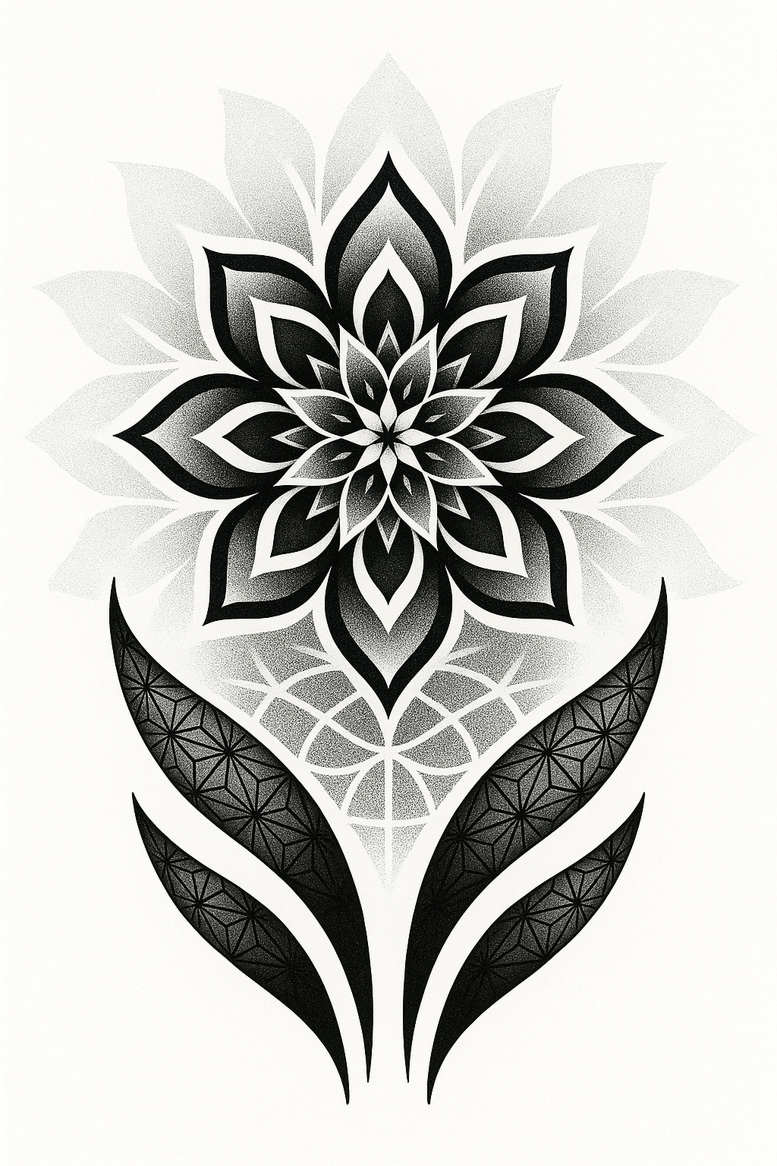 An AI-generated tattoo project featuring a bold black-and-grey mandala lotus design rising from geometric leaves, executed with precision line work and subtle shading. The central motif is a multilayered mandala comprised of overlapping petal shapes that radiate outward in a symmetrical bloom, creating a focal point that feels both meditative and modern. Surrounding this core, a lattice of fine lines forms a patterned transition into the lower half of the composition, where angular leaf shapes and tessellated textures echo traditional Japanese style tattoo aesthetics while staying accessible to a wide range of placements. The entire piece relies on high-contrast black ink with delicate grayscale gradients, producing crisp edges and a strong silhouette that remains legible even when scaled down. This makes it a strong candidate for a cover-up on older tattoos, as the density of dark areas can mask underlying imagery when tattooed with careful shading and proper skin tone considerations. The lotus symbolism conveys purity, rebirth, and spiritual awakening, while the mandala conveys balance, harmony, and focus—qualities many clients seek in meaningful tattoos. The geometric leaves introduce an architectural rhythm that adds depth without overwhelming the central lotus; the pattern-like repetition of shapes gives the design a timeless quality that transcends trends, aligning well with small tattoos or larger back or sleeve pieces. For practitioners, this design offers a clear blueprint of negative space, line weight, and shading transitions ideal for translating a digital concept into a living tattoo. It also demonstrates how AI-generated tattoo projects can inspire traditional tattooing while inviting personalized tweaks to suit individual anatomy and skin texture. In terms of SEO, this piece stands as a representative example of a fine line tattoo approach to lotus flower tattoo design, black and grey tattoo art, custom tattoo design in a Japanese-inspired context, with references to infinity tattoo hints, tribal tattoo motifs, and geometric mandala collections. Its strong monochrome palette ensures longevity and easy touch-ups, making it a practical choice for dedicated body art collectors and first-time tattoo enthusiasts alike.