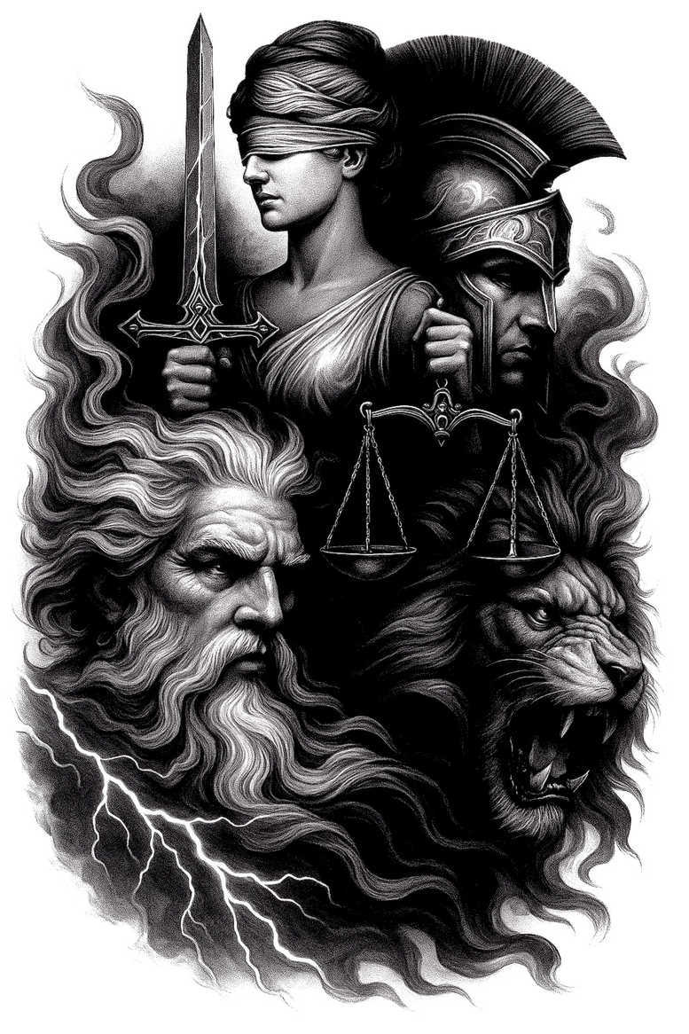 Themis-inspired tattoo design narrative centers on a powerful, mythic scene rendered in black and grey that translates the ancient goddess of justice into a bold, magazine-worthy tattoo concept. The central figure is a commanding goddess of justice, her silhouette carved with carefully graded shading to suggest volume and gravitas, while her scales hover aloft as a symbol of balance and fairness. A sword anchors the composition, its blade pointing downward to convey authority and the enforcement of law, while a bearded man stands to one side, adding narrative tension and a sense of timeless judgment. The overall aesthetic leans toward realistic black and grey technique, with crisp line work defining edges and a nuanced gradient that yields a dramatic, almost monumental impact on skin. The piece embraces a symmetrical rhythm, with mirrored or recurring motifs around the central axis that create a pattern-like cadence, guiding the viewer’s eye through foreground to background. In terms of meaning, the tattoo design speaks to universal themes of justice, order, and moral responsibility; Themis embodies divine law in Greek mythology, the scales denote impartial judgment, and the sword embodies the power to enforce consequences. The interaction between the two figures suggests dialogue between law and humanity, reminding the wearer that justice is both principle and practice. This is an AI-generated concept that blends classical iconography with contemporary body art sensibilities, offering a modern take on an ancient myth and inviting meaningful tattoos enthusiasts to reflect on balance and accountability while enjoying a bold black and grey aesthetic. Due to the depth of black and density of shading, the design is particularly well-suited as a cover-up option on darker skin tones or previous tattoos, and the strong silhouette ensures legibility when scaled to larger sizes. The repeating motifs and high contrast contribute to a dramatic presence that translates well to a professional portfolio or gallery presentation, while remaining adaptable for placements from forearm to back. In sum, this tattoo design merges mythic symbolism with a contemporary, custom tattoo design approach, delivering body art that is meaningful, visually striking, and suitable for readers seeking a powerful narrative in black and grey ink, with the option for a cover-up that preserves the integrity of the composition.
