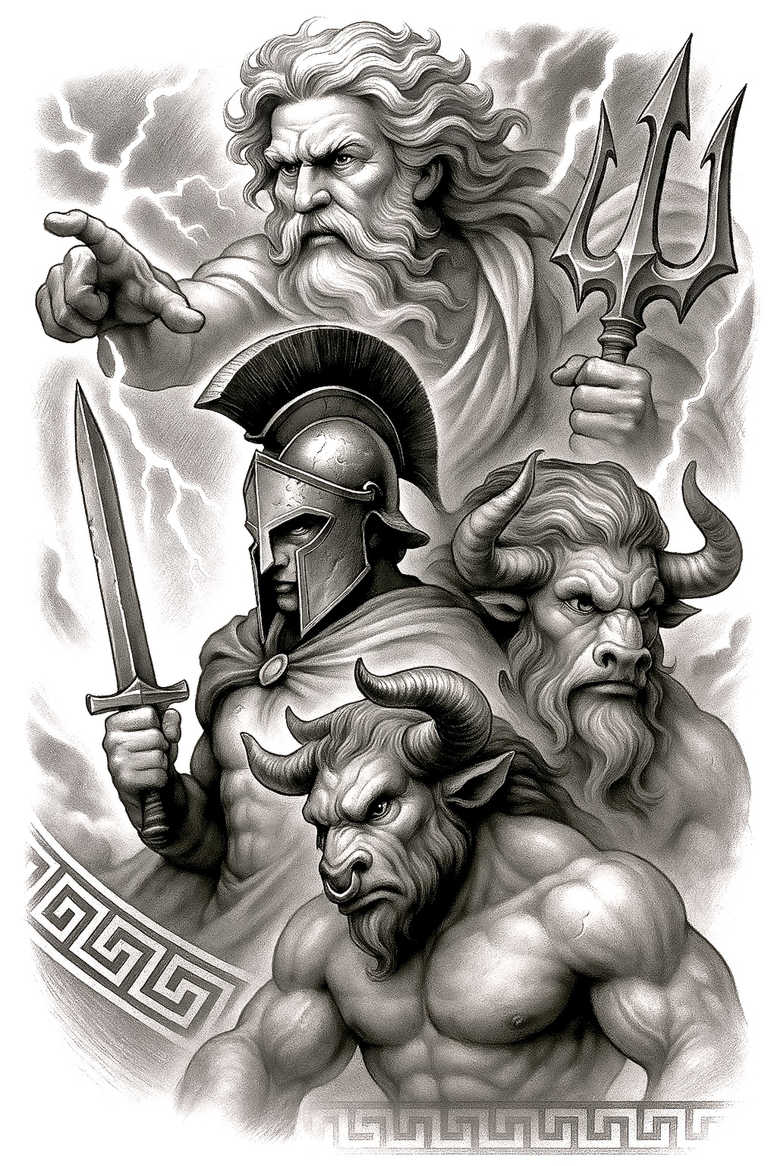 AI-generated tattoo project concept: This black and grey montage presents a mythic triad in a single scene: a central warrior in a helmet wields a sword, a minotaur crouches at his side, and a thunder god with a trident looms behind them as lightning splits the sky; the shield bears a Greek key pattern that grounds the composition. Rendered in high-contrast grayscale, the piece emphasizes form, texture, and dramatic shading to create a bold, realistic tattoo feel that suits large surfaces or sleeve layouts. The warrior’s firm stance and focused gaze express courage and duty, the minotaur’s muscular frame and fierce countenance evoke primal power, and the ancient elder’s pointing gesture suggests fate or guidance; together they tell a story of protection, resilience, and confrontation. The arrangement balances negative space with dense shadow, guiding the viewer’s eye from the blade to the beast and to the stark figure in the background, while the lightning adds kinetic energy to the composition. This tattoo design can be adapted for various body placements, with the Greek key border offering a timeless frame that complements black and grey tattoo styles; the work nods to traditional patterns and modern fantasy aesthetics, allowing for customization in line weight, shading, and scale while preserving readability on the skin. The concept aligns with meaningful tattoos by offering symbolism around courage, conflict, and destiny, and it can be expanded into additional elements such as lotus or rose motifs if desired to enhance the narrative; in any case, it remains a strong example of a custom tattoo design that leverages black and grey realism, strong outlines, and textured shading to achieve a striking body art piece. Note that this is an AI-generated tattoo project concept and is perfect for a cover-up due to its dense dark massing; it can be refined by an experienced artist to tailor line work and shading to individual skin tones and placement. Keywords to guide the project include tattoo, tattoo design, meaningful tattoos, fine line tattoo, lotus flower tattoo, infinity tattoo, tribal tattoo, rose tattoo design, small tattoos, flower tattoos, custom tattoo design, Japanese style tattoo, black and grey, realistic tattoo, body art, ink.