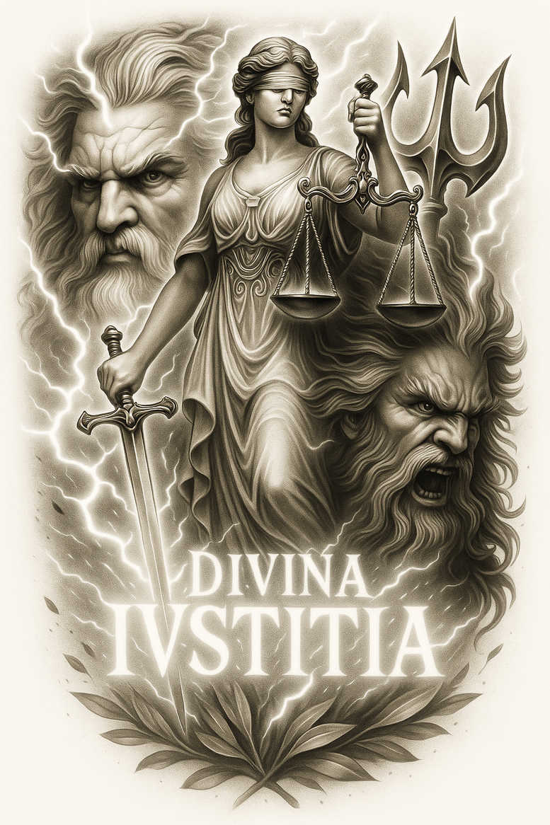 This tattoo design is part of a gallery inspired by Zeus from Greek mythology and presents a dramatic, emotionally charged composition in black and grey. The central motif places a goddess with scales of justice beside weathered, grand heads that suggest Zeus’s sovereign presence, framed by a cascade of thunderbolts that cut through a stormy, cloud-laden sky. The tiered arrangement reads almost like a bas-relief, with the left head anchoring the scene and the right head providing counterbalance, while the serene goddess occupies the middle ground as a focal point of calm authority. The scales float above her hands, a universal symbol of balance, judgment, and the governing order of the cosmos, tying together power, mercy, and fate. The artist uses refined line work, cross-hatching, and selective shading to achieve a lifelike yet timeless feel; the hair, robes, and drapery flow with a natural rhythm that guides the eye through the composition. Laurel sprigs punctuate the corners, and a decorative frame encloses the tableau, lending a classical temple aesthetic that enhances readability on the skin. Symbolically, Zeus stands for sky, thunder, and rule; the goddess represents justice and moral order; the lightning embodies power and warning; the laurel marks achievement and honor. The design is well-suited to mature skin and can be scaled to fit different body areas. This AI-generated concept emphasizes strong silhouettes and dramatic contrast, ensuring a bold impact while preserving detail in fine line work that characterizes modern realism. This is a tattoo gallery inspired by Zeus from Greek mythology, and it speaks to meaningful tattoos and classic mythic themes, with possibilities for customization in a custom tattoo design approach. Given the image’s considerable darkness and shading, the composition is particularly suitable as a cover-up piece for clients looking to transform older work or conceal scarring, while delivering a new legendary narrative on the skin.