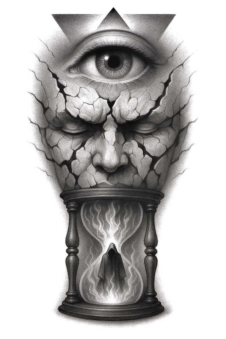 This concept presents a dark, surreal tattoo design that merges a cracked stone face with a molten hourglass silhouette, inviting contemplation on time, transformation, and mortality. The central face appears weathered and fractured, its surface broken into angular plates that catch light with soft gradients of black and grey. An imposing eye hovers above the brow, while a triangular motif crowns the composition, lending a geometric contrast to the organic textures. Framing the lower part, the hourglass rests on a classical pedestal and houses a hooded figure surrounded by ethereal flames, suggesting a soul venturing through time and memory. The piece relies on fine line shading, stippling, and smooth transitions between light and deep shadow to achieve a highly realistic look in black and grey ink. This tattoo design emphasizes negative space and crisp edges to create drama without relying on color, making it both timeless and versatile for placement on the forearm, upper arm, or back. The cracked texture in the face acts as a metaphor for vulnerability and renewal, while the hourglass evokes inevitability and the cycles of life. The hooded figure within the glass anchors the scene in mystery, inviting interpretation: is it a guardian, a prisoner of time, or a representation of a personal guide? The triangle at the top reinforces balance and focus, guiding the eye toward the center of the composition. This is a strong candidate for custom tattoo design work for those seeking meaningful tattoos that blend symbolism with a contemporary aesthetic. The concept aligns with genres such as black and grey realism, tribal-inspired lines for structure, and Japanese style tattoo’s emphasis on form and restraint; it also nods to infinity and rose tattoo design motifs through its enduring, monochrome palette. Because the image relies on deep shadows and dense texture, it is especially suitable as a cover-up tattoo design for someone looking to transform an existing piece into a dramatic, cohesive scene. This AI-generated tattoo project illustrates how digital concepts can translate into body art, offering a blueprint for skilled tattoo artists to adapt into a living, breathing work of ink. In sum, the cracked-face hourglass with a hooded figure is a visually arresting study in contrast and meaning, a bold statement in black and grey that blends realism with surreal symbolism, and a versatile starting point for bespoke tattoo projects.