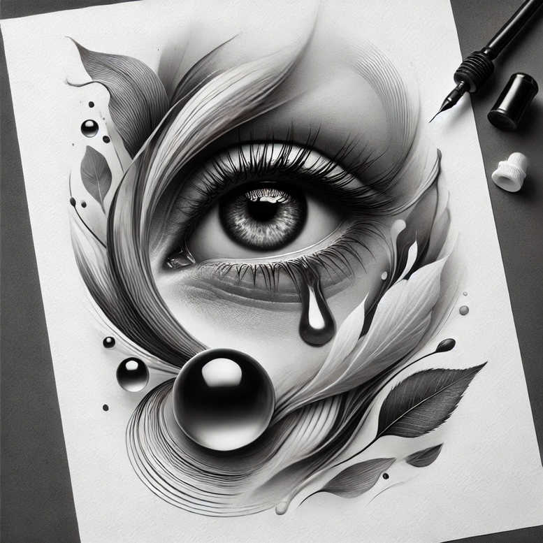 This image presents an AI-generated tattoo project that combines a hyper-detailed eye with organic and geometric flourishes in black and grey. The central motif is a realistically rendered eye, the iris carved with fine line radiations and a glossy highlight that gives depth against a softly shaded sclera. A teardrop shapes flows from the lower lid, merging with swirls of curved leaves and petal-like forms that wrap around the eye in a continuous motion. Interlaced among the organic elements are spherical orbs and circular rings, creating a deliberate contrast between softness and structure. The line work emphasizes precision: feathered strokes define the lashes and lid contour, while crisp outer lines anchor the surrounding elements. The shading relies on smooth gradients, cross-hatching, and subtle stippling to achieve a convincing three-dimensional look in a grayscale palette. The composition balances intimate detail with bold graphic accents, making it a strong stand-alone tattoo design and a versatile cover-up option for darker tattoos beneath. The image invites interpretation: eyes as perception, tears as release, foliage as growth, and orbs as thought or memory, yielding a meaningful tattoo design with potential for personalization in size and placement. As a body art concept, it embraces modern tattoo trends: fine line technique, black and grey realism, and a thoughtful integration of negative space to preserve clarity on skin. For search and reference, it aligns with keywords such as tattoo, tattoo design, meaningful tattoos, fine line tattoo, black and grey, realistic tattoo, flower tattoos, and custom tattoo design, while remaining adaptable to variations in style or scale. This is an AI-generated tattoo project, illustrating how algorithmic design translates into intricate, scalable ink concepts.
