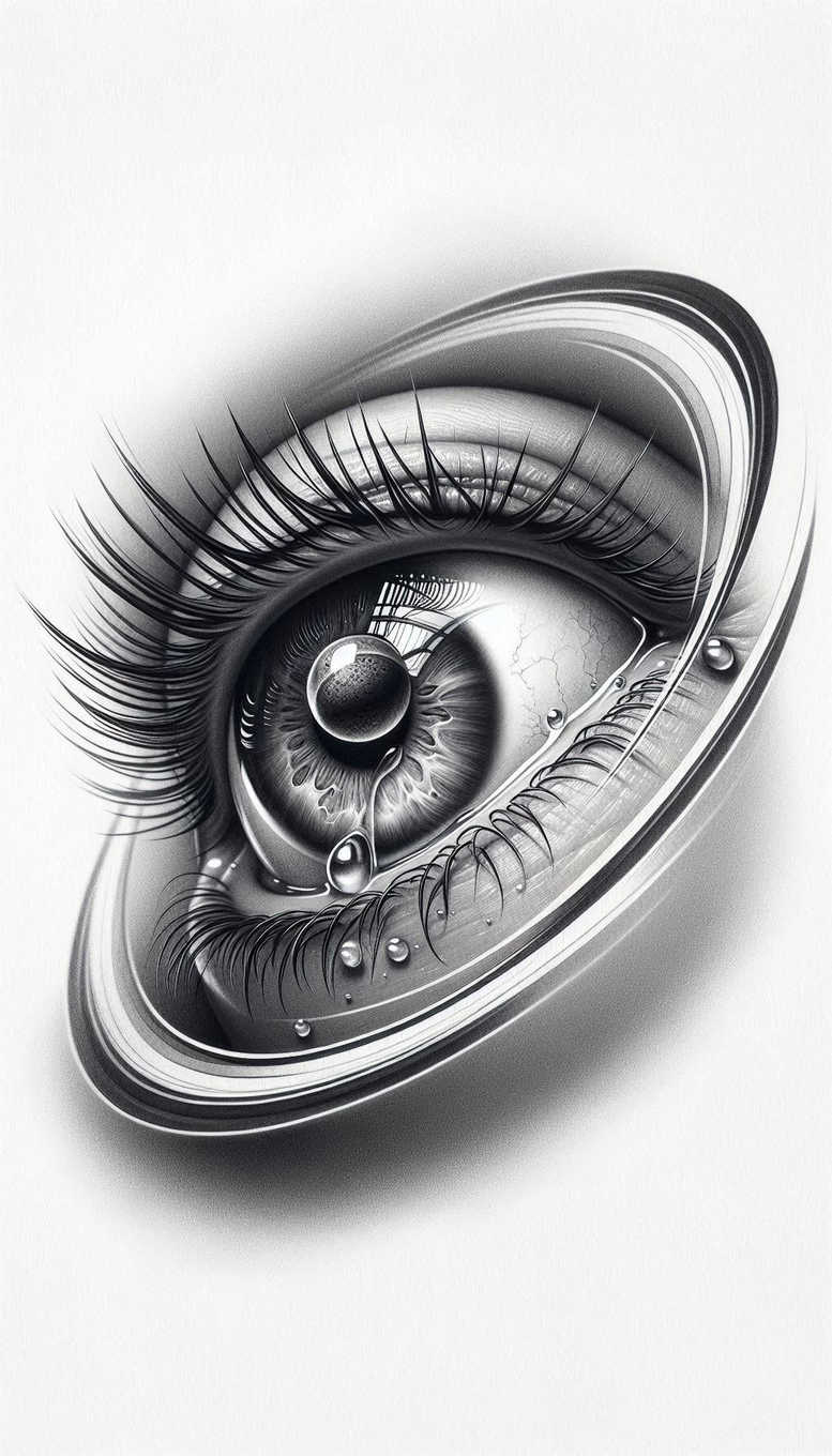 Rendered in immaculate grayscale, this tattoo design centers on a hyper-real eye, capturing the texture of the iris, the gleam of a reflection, and the fine micro-shading that suggests moisture on the cornea. Surrounding the eye, curved bands sweep in smooth arching loops, creating a circular pattern that frames the pupil and lends the piece motion and depth. The lashes branch into long, delicate lines that contrast with the dense shading around the eye, while small droplets cling to the lower lid, adding a hint of melancholy. The rings resemble brushed metal or lacquered arcs, weaving around the eye to fuse organic anatomy with mechanical ornament, an elegant, surreal motif for a tattoo design. The black and grey palette emphasizes volume, contrast, and texture, with deep blacks for structure and soft grays for transitions. As an AI-generated tattoo project, it showcases how digital rendering can inspire contemporary fine line tattoo concepts and meaningful tattoos for body art. The graphic pattern is intentional: the circular motifs act as a framing device that can scale to larger canvases or adapt to refined small tattoo design. The symbolism is open to interpretation: the eye represents perception and vigilance, while the surrounding rings convey continuity and cycles, suggesting that vision can be worn as ink. For clients seeking a statement piece that remains elegant and precise, this concept serves as a template for artists specializing in black and grey realism, fine line work, or Japanese-inspired motifs, with room for adjustment in line thickness, shading, and scale. In short, a sophisticated tattoo design that blends realism and abstraction for a striking yet refined body art statement. The tonal range and the interplay of light and shadow make this piece flexible for different placements and skin tones, while preserving clarity of detail and rhythm of the lines.