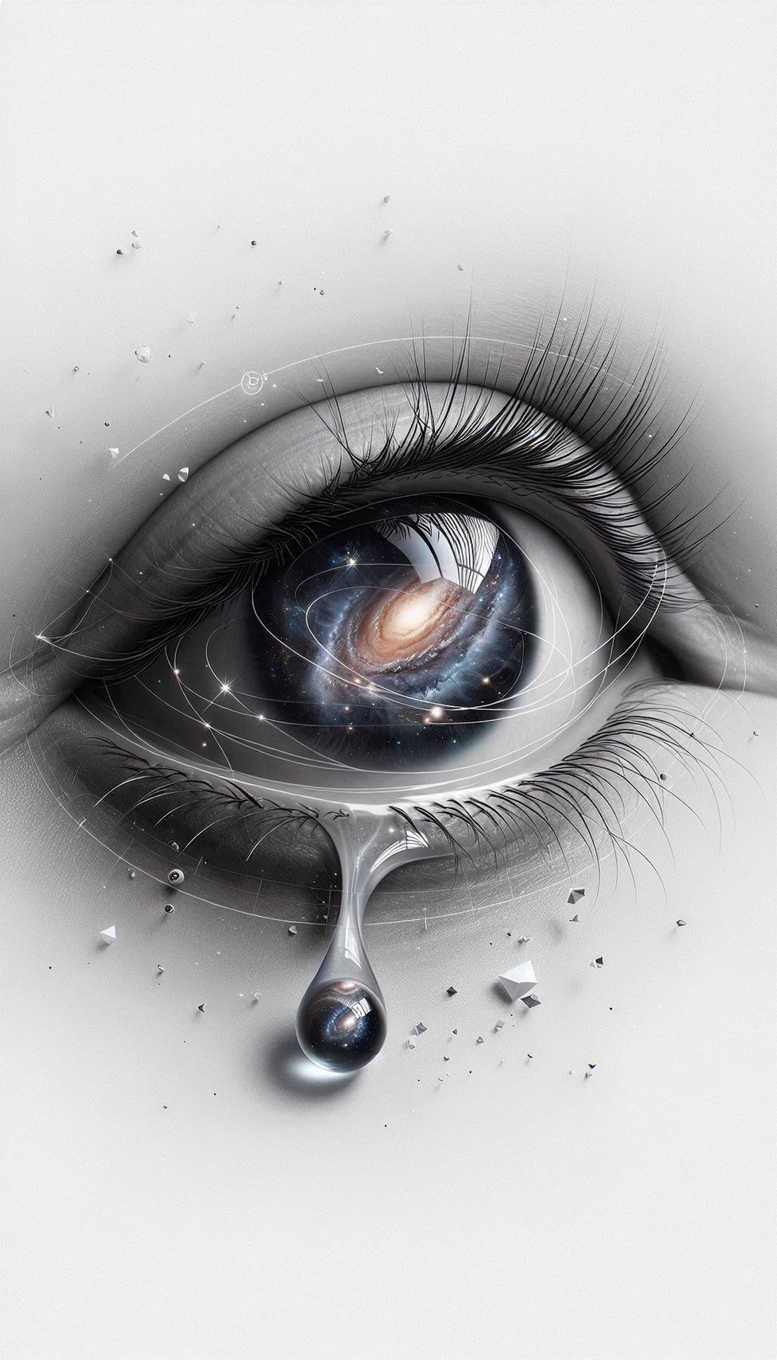 This is an AI-generated tattoo project realized as a grayscale, hyper-detailed surreal composition suitable for a bold body art statement. The central motif is a realistic eye, rendered with meticulous line work on the lashes and a soft tonal gradient around the eyelid to create depth. Within the iris, a miniature cosmos unfolds: a swirling galaxy, distant stars, and a rim of light that seems to orbit the pupil. Surrounding the eye are orbital rings and wispy arcs that contribute a sense of motion and geometry, producing a graphic pattern that enhances the overall visual rhythm. A teardrop forms from the lower lid, elongating into a reflective bead that anchors the composition while echoing the cosmic theme. The shards and fragments scattered around the image evoke a crystalline texture, as if the skin itself has fractured to reveal the universe beneath. The symbolism blends emotion with exploration—tears becoming gateways to vast space, suggesting that inner worlds endure beyond surface appearance. In terms of technique, the piece leans into black and grey shading with controlled contrast, crisp linework, and subtle highlights to preserve legibility when scaled for tattoo design on the arm, chest, or back. Because this is an AI-generated tattoo project, it showcases how digital artistry can translate into a customizable design: a meaningful tattoo that pairs with other motifs such as lotus flower tattoo, infinity tattoo, or rose tattoo design, while remaining versatile for small tattoos or larger canvases. The concept also resonates with Japanese style tattoo aesthetics through clean lines and balance, yet remains within the realm of modern body art and ink. This piece invites clients seeking a striking, pattern-rich tattoo design that communicates wonder and emotion, and it offers a built-in potential for future cover-up considerations if required, thanks to its layered grayscale gradients and dense midtone shading.