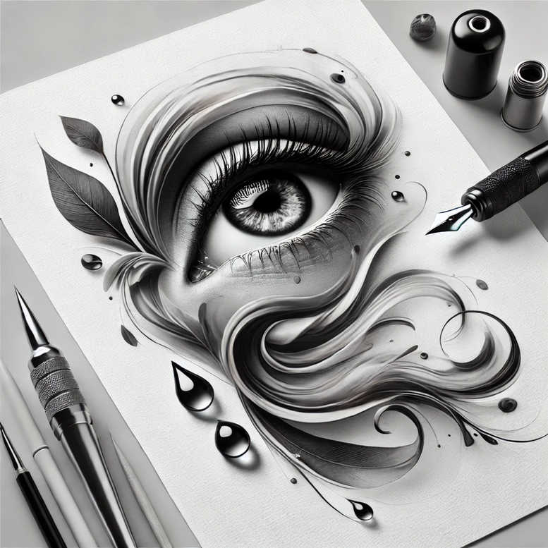 This flowing black and grey tattoo design centers on a hyper-realistic eye, its iris and lashes rendered with fine line shading that blends into sweeping hair-like swirls. Botanical leaves weave around the eye, while droplets and tiny highlights add moisture and motion. The composition is balanced and dynamic, with bold contrasts, subtle gradient shading, and crisp edges that mimic graphite or charcoal textures on skin. The piece reads as a hybrid of realism and abstract ornament, suitable for a dramatic statement on the upper arm, ribcage, or back. The shading rests on layered blacks and cool greys, building depth from a bright highlight at the cornea to deep shadows along the lash line, with hair streams curling outward to guide the viewer’s gaze along the natural curves of the body. Leaves emerge as delicate parapets of negative space, while rounded droplets provide focal points that catch light as the tattoo ages. The overall velocity of lines suggests motion, as if wind or water sweeps across a surface, a motif apt for conveying change, resilience, and perception. This is an AI-generated tattoo project, illustrating how digital design can translate into a wearable piece that preserves texture and subtle tonal variation. For tattoo lovers seeking meaning, the eye is a timeless symbol of vision and awareness; paired with leaves and droplets it can signify growth, renewal, and the passage of time. The concept supports a range of applications—from fine-line tattoo details for a small piece to a larger, more cinematic black and grey tattoo design statement—while remaining adaptable to Japanese-style or realistic tattoo approaches, small tattoos, and extensive body art. In practice, a skilled artist would translate the soft gradations into durable skin tones, preserving the crisp edge of the iris and the feathering of lashes, while maintaining the interplay of light and shade that gives the piece its lifelike presence.