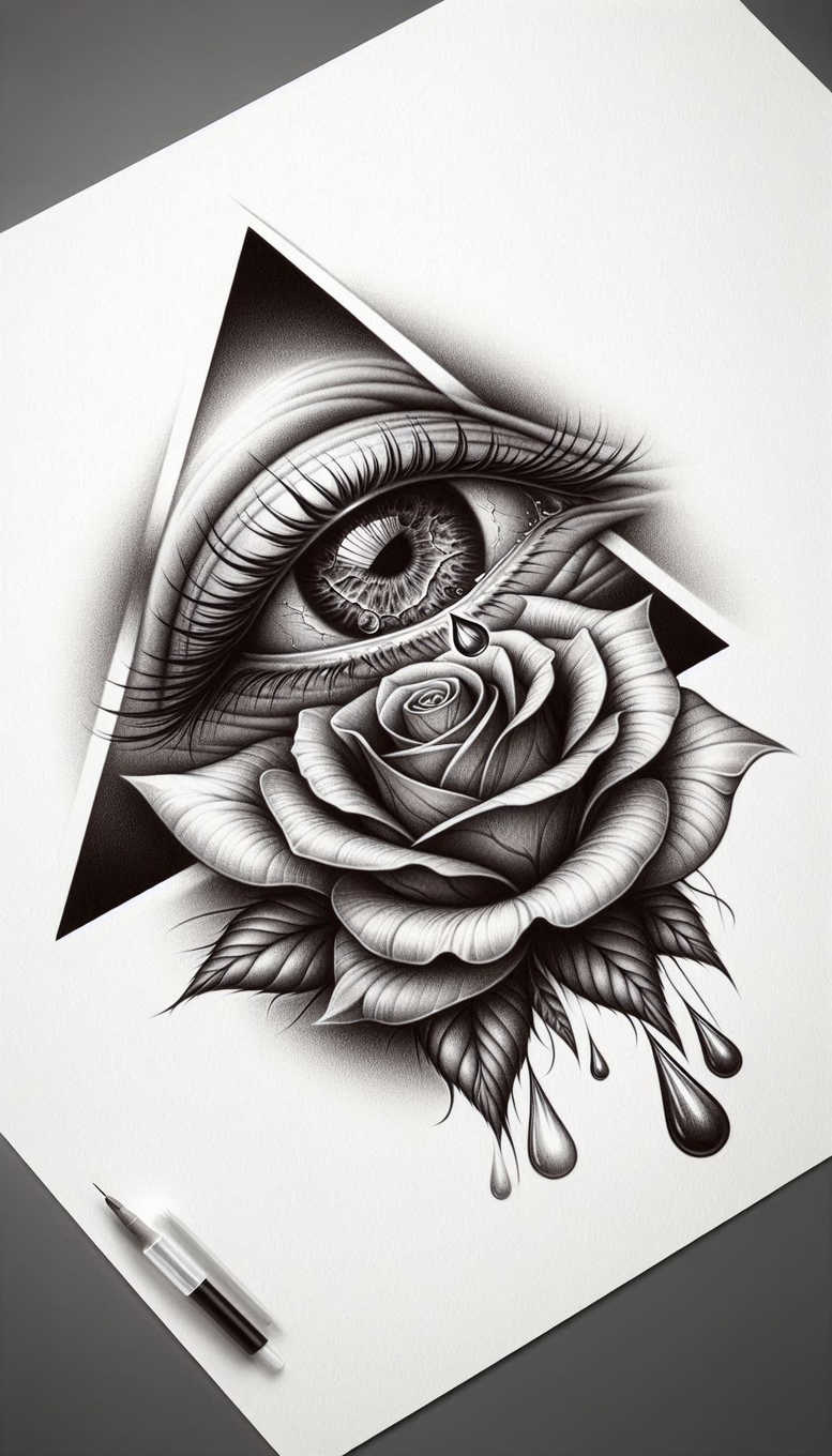 AI-generated tattoo projects push the boundaries of contemporary ink, and this piece exemplifies a bold synthesis of natural motifs with geometric precision. Rendered in black and grey with crisp linework and smooth gradient shading, the design pairs an oversized eye with a tightly curled rose, framed by angular triangles and trailing teardrops. The eye features a detailed iris and long lashes, anchoring the composition while the rose wraps around the pupil, suggesting beauty emerging from perception and resilience. Teardrops add motion and emotional resonance, while the triangular shards introduce a graphic pattern that gives the composition a modern edge. Leaves extend from the rose, providing organic contrast to the precise geometry and enhancing depth through subtle shading. The whole is presented on a white surface, which heightens the clarity of line and the contrast between light and shadow, making it a compelling tattoo design for larger canvases such as the upper arm, back, or chest. The symbolism is rich: vision and insight, beauty and endurance, sorrow and rebirth, a narrative that can be carried as a personal meaning in ink. From a technique perspective, the piece showcases fine line work, bold blacks and soft grey transitions, micro-shading in petals, fine detailing in the iris, and careful layering to create realistic texture on skin. The geometric triangles act as a stylish counterpoint to the organic forms, offering a sophisticated blend that resonates with fans of pattern-driven tattoos while remaining readable at a distance. As an AI-generated tattoo project, it reflects current trends in digital design workflows and invites adaptation for different placements or sizes without losing its core motif. Because the contrast is strong, the design is highly suited to cover-up scenarios if the client is transitioning from a darker tattoo, ensuring longevity and readability of the line work and shading over time; this piece stands as a versatile, meaningful tattoo option that embraces both classic symbolism and contemporary aesthetics.