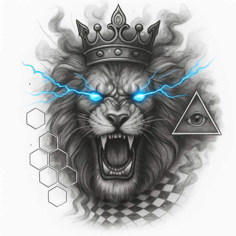This AI-generated tattoo project presents a commanding lion head crowned with a regal band, rendered in black and grey with dense shading, crisp fur texture, and a ferocious open roar. The electric cobalt-blue eyes crackle with energy, creating a bright focal point that contrasts with the grayscale palette and gives the piece a bold, modern edge. On the left, a hexagon honeycomb panel introduces a geometric rhythm, while on the right a triangular glyph frames an all-seeing eye, both counterpoints that add conceptual depth and balance within the composition. A checkerboard underlay anchors the drawing, providing a classic pattern motif that enhances movement and depth, and wispy smoke-like shading curls around the crown to suggest atmosphere. The symbolism weaves themes of authority, vigilance, and strategic thinking: the lion embodies kingship and courage; the crown signals sovereignty; the hexagon network hints at structure and connectivity; the all-seeing eye evokes awareness and insight; the checkerboard nods to planning and tactics. Technically, the piece employs a range of shading transitions from deep blacks to soft grays, with crisp linework for geometry and careful negative space to preserve legibility at different scales. The color palette remains deliberately monochrome with selective blue accents to emphasize the eyes, a choice that supports strong readability on skin and provides flexibility for future overlays or additions in a sleeve or back piece. This tattoo design is meaningful and suited for ink enthusiasts who appreciate bold, high-contrast black and grey realism, combined with geometric elements and symbolic motifs found in Japanese-inspired and tribal tattoo aesthetics. As an AI-generated tattoo project, it explores contemporary composition while remaining practical for longevity, aftercare, and versatile placement. It is also a strong candidate for a cover-up due to its dense shading and capable of masking older tattoos without compromising current ink.