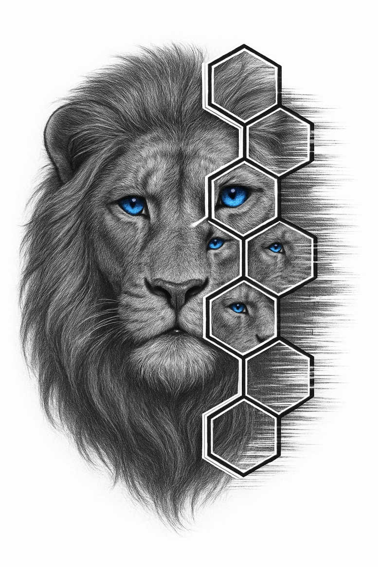 An AI-generated tattoo project presents a striking realism study: a lion portrait rendered in meticulous black-and-grey shading, its gaze intensified by electric blue eyes. The composition splits the image with a vertical field of hexagonal panels along the right edge, the hexagons outlined in bold white to contrast against the grayscale fur. The left side bears the lion’s mane in soft gradations, while the right paneling introduces graphic geometry that doubles as a contemporary pattern. The ink work emphasizes careful shading, cross-hatching, and crisp line work to convey fur texture and the glassy gleam of the eyes. The hexagon motif adds a modern twist, suggesting tessellated strength and a sense of order versus power. The overall effect is a dynamic centerpiece or a bold cover-up, depending on placement. The piece invites a close look: the eyes are deliberately colored to stand out, while surrounding grayscale values fuse naturalism with geometric contrast. As a tattoo design, it supports a large-scale back or chest piece but can be adapted to a prominent forearm or calf, or even a sleeve; it nods to trends in realistic tattooing and fine line tattoo techniques. The concept blends a timeless symbol with a geometric pattern, appealing to meaningful tattoos and the broader vocabulary of body art: lotus flower tattoo, infinity tattoo, tribal tattoo, rose tattoo design, small tattoos, flower tattoos, custom tattoo design, Japanese style tattoo, black and grey, realistic tattoo, ink. Its AI origin is acknowledged in the concept, highlighting this as an AI-generated tattoo project. For clients seeking cover-up potential, the dense shading on the left and the high-contrast right-hand panel provide a robust canvas for concealing older work while delivering a striking new portrait. In sum, this design offers a versatile option for a bold body art piece with enduring visual impact.