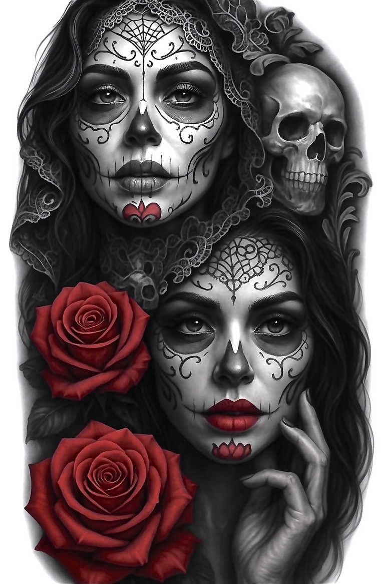 AI-generated tattoo project concept presenting a two-figure sugar skull composition intertwined with roses, lace, and a skull witness in grayscale. The central motif is a pair of female faces rendered with sugar skull makeup—eyelids shaded, cheek filigree, and a mirrored brow crest—connected by flowing hair and filigree that resembles a lace parasol. A third skull peeks from behind the scene, adding depth and a classic gothic counterpoint. The roses bloom in rich red, their petals constructed with smooth gradients and selective white highlights to preserve a photographic realism against the velvety grayscale. The lacework and ornamental patterns are executed with fine-line precision, producing a pattern-rich surface that reads well in both large-scale backpieces and smaller placements. The shading relies on black and grey techniques: layered washes, crisp edge work, and controlled stippling to achieve texture in skin, bone, and fabric. The design integrates elements of contemporary tattoo design with traditional sugar skull iconography, allowing a narrative of memory, beauty, and mortality to unfold across the skin. Symbolically, roses stand for love and endurance, while the Day of the Dead aesthetics honor loved ones and resilience. From a practical standpoint, the piece is engineered for strong readability at various sizes, and its strong contrast ensures longevity on skin. For cover-up purposes, the dense dark values and rich patterning enable effective masking of older tattoos, making it ideal for clients seeking a fresh, cohesive black and grey tattoo design. As an AI-generated tattoo project concept, it demonstrates how graphic patterns and realistic shading can merge to create a bespoke custom tattoo design with gemstone-like depth. Those who prefer Japanese-inspired symmetry or tribal linework can adapt the motif while preserving the core sugar skull and rose symbolism, resulting in a versatile portfolio piece that suits small tattoos or grand compositions alike. The work embodies a modern interpretation of ink as a storytelling medium, combining classic motifs with modern technique and offering a pathway for a meaningful tattoo journey.