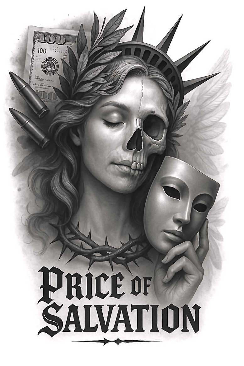 This tattoo design presents a highly detailed grayscale composition that blends classical portraiture with symbolic imagery. The central figure is a woman’s serene face, half merged with a skull, signaling mortality and the price of salvation. A masked hand adds mystery and duality, while behind the head a crown of thorns and a laurel halo evoke sacrifice, virtue, and victory. A folded dollar bill beneath the hair introduces wealth as a provocative counterpoint to mortality, and two bullets suggest danger and the fragility of life. Wings extend from the back, hinting at ascent or escape, while bold Gothic typography at the bottom proclaims “Price of Salvation,” anchoring the piece with a legible, narrative claim. Realistic black-and-grey ink and careful shading create a smooth gradient transition across skin tones, hair, metal, and cloth, allowing the design to read as a unified portrait from afar while rewarding close inspection with textures and line work. This is an AI-generated tattoo project that translates digital composition into tattoo-ready art, offering a versatile framework for cover-up use or a standalone statement piece. The motif set—mortality (skull), anonymity (mask), material desire (dollar bill), conflict (bullets), nature (laurel, wings), and sacred iconography (thorn crown)—tells a story about identity, loss, and the tension between material and spiritual worth. For practitioners, it can be adapted to large placements such as the back or chest, with adjustable line weight and shading to suit personal style, skin tone, and ink preferences, including full black and grey or subtle fine-line treatments. In terms of search-friendly language, the design aligns with tattoo design, meaningful tattoos, fine line tattoo, black and grey, realistic tattoo, and ink.