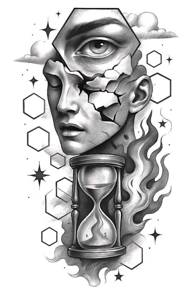 An AI-generated black and grey tattoo project presented as a bold exploration of time and fracture. The design centers on a fractured human face, its right side dissolving into shards while an hourglass anchors the lower portion, symbolizing the passage of time. On the forehead, an eye sits within a hexagonal frame, introducing a surreal juxtaposition that blends portrait realism with geometric abstraction. Surrounding wisps of flame and drifting clouds weave through a field of hexagons and scattered stars, creating a pattern-rich backdrop that enhances depth and rhythm. The shading uses a restrained black and grey palette, with meticulous cross-hatching, smooth gradients, and sharp line work to render the cheeks, jawline, and glass facets of the hourglass. The cracks across the face are bold and graphic, emphasizing themes of resilience, reconstruction, and the impermanence of memory. This composition plays with negative space to produce strong contrast, making the central motif pop while allowing for flexible sizing—from a small forearm piece to a larger back or sleeve. The geometric elements function as a cohesive pattern, but they never overwhelm the portrait, keeping the design legible over time on skin. As a tattoo design concept, it nods to fine-line technique and black and grey realism, while embracing pattern-driven geometry that suits a modern, bold look. If inked with patient shading and careful linework, it becomes a meaningful tattoo suited for cover-up, capable of masking older tattoos beneath the new illustration. Keywords such as tattoo, tattoo design, meaningful tattoos, fine line tattoo, black and grey, pattern, and cover-up echo throughout the narrative, ensuring the concept is discoverable to clients seeking a dramatic, time-themed body art piece.