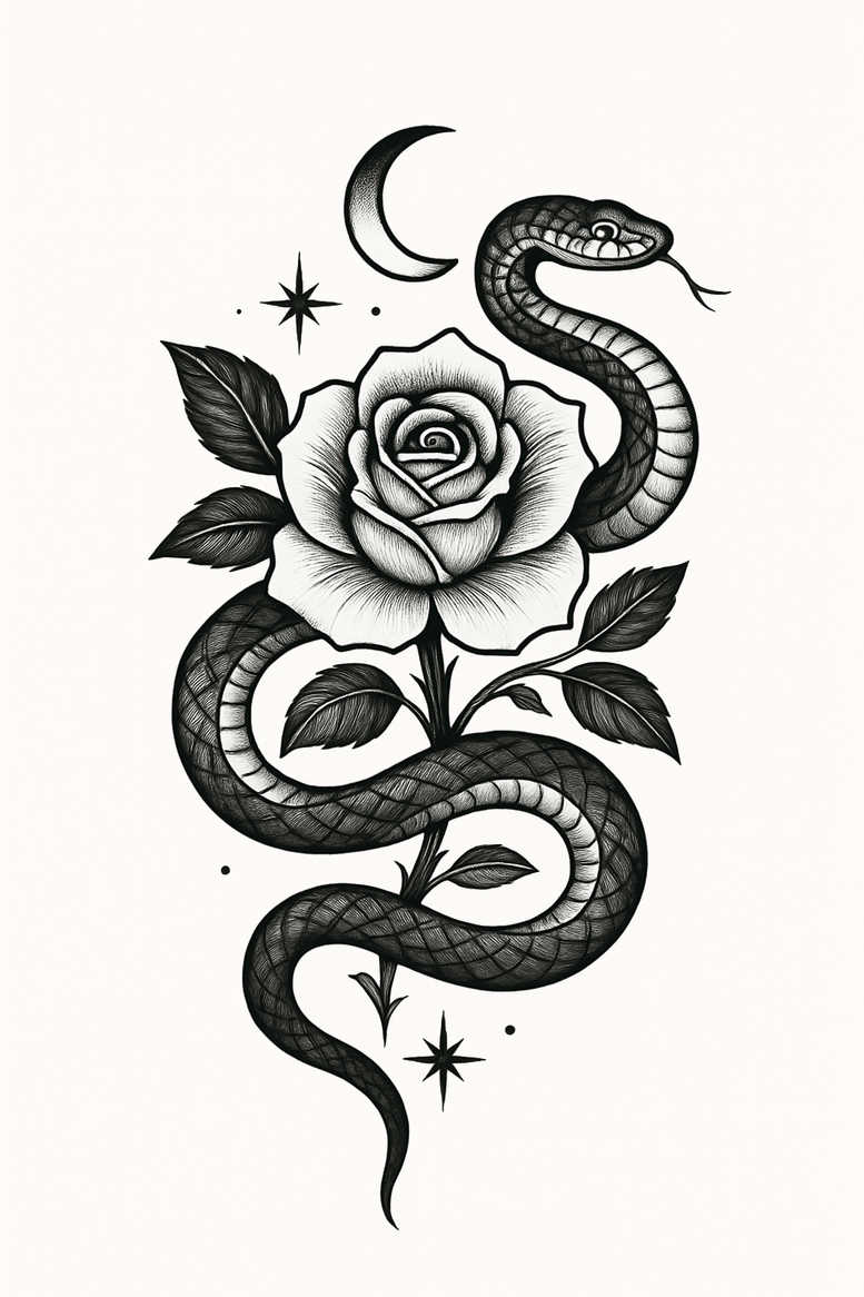This is an AI-generated tattoo project design featuring a rose and a coiled snake rendered in black and grey. The composition centers on a blooming rose whose layered petals are built with fine line shading and subtle cross-hatching to create depth, while a sinuous snake wraps around the stem and through the surrounding leaves. The scales on the serpent form a clear graphic pattern that adds texture without compromising legibility when inked on skin. Leaves sprout from the rose, providing negative space and balance against the creature’s weighty form. Celestial accents—a crescent moon and small stars—enhance the nocturnal mood and give the piece opportunities for negative space in the surrounding skin. The overall design reads bold yet refined, suitable for large placements such as back or forearm, as well as smaller pieces that benefit from strong silhouette. The technique relies on crisp linework and a carefully graded black-and-grey palette to achieve realism while maintaining a stylized edge. Symbolically, the rose conveys love and growth, while the snake hints at rebirth and resilience, making this a meaningful tattoo concept for those who value transformation. The recurring scales pattern and the floral shading showcase a fusion of traditional and contemporary tattoo aesthetics, and the design adapts well to custom tattoo design by adjusting size, line weight, and shading. This piece also serves as a practical cover-up option due to its dense dark mass and prominent silhouette, with room for adjustments to obscure prior ink while preserving the central motifs. As an AI-generated tattoo project, it offers a versatile reference for tattoo design enthusiasts seeking fine line, black-and-grey body art, and meaningful tattoos in a cohesive composition.