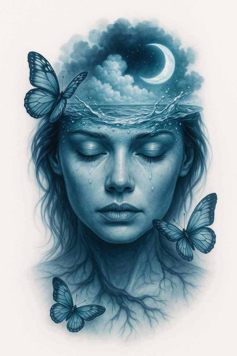 This is an AI-generated tattoo project that pairs portraiture with a surreal seascape in a blue-toned palette. The focal point is a calm, closed-eyed face rendered with soft shading to achieve realism and a serene expression. Across the forehead a horizon of water forms the headband of the scene, with splashes and droplets tracing down the cheeks, suggesting tears, mist, or memory and symbolizing renewal and inner depth. Above the head, a crescent moon sits among wispy clouds, anchoring the composition in nocturnal mystery and cycles of change. Three butterflies drift around the jawline, their fine-line outlines delivering crisp contrast and a hint of metamorphosis to the design. The artwork blends realism with delicate linework, yielding a cohesive tattoo design that reads as both portrait and landscape, intimate yet expansive. Its black and grey foundation is enhanced by a cool blue inflection, enabling smooth gradients and subtle texture that translate well to skin. While the concept can stand alone, it also functions as a cover-up piece for darker ink, depending on placement and scaling. The piece supports a range of applications—from small tattoos to larger body art—emphasizing a custom tattoo design that speaks to transformation, memory, and the passage of time. The AI origin underscores precision and artistry, yet the result aims for a timeless, refined mood with strong contrast and careful edge definition that ensure longevity on the body. This concept appeals to enthusiasts of fine line tattoo and Japanese-inspired aesthetics, offering a meaningful, dreamlike ink that blends natural imagery with portraiture in a single, wearable composition.