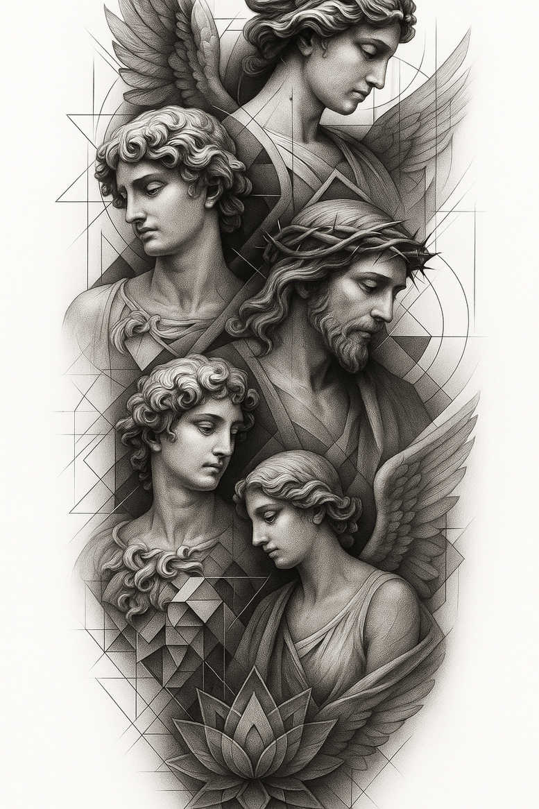 An elegant fusion of classical relief sculpture and geometric abstraction, this tattoo design presents a dynamic composition of celestial guardians surrounding a lotus bloom. The central cluster of angels is rendered in a black and grey palette with meticulous shading that creates the sense of depth and three-dimensional form. Each figure expresses quiet reverence, their hair and robes flowing into crystalline lines that interlock with a lattice of triangles, circles, and straight edges. The geometric pattern acts as a structural frame, guiding the eye from the upper wings to the lotus at the base while never overpowering the figurative elements. The lotus serves as a living anchor, its petals opening outward to symbolize growth, rebirth, and inner balance—themes often chosen for meaningful tattoos. The wings are feathered with delicate cross-hatching and subtle gradations that produce a soft yet legible contrast against the geometric background, allowing the figures to stand apart while still living within a cohesive whole. The shading ranges from cool mid-tones to near-black shadows, producing a sophisticated monochrome look that is ideal for a realist approach to black and grey ink. The technique blends fine-line precision with broader tonal blocks, achieving a balance between linework and volume that is both timeless and contemporary. From a distance, the composition reads as a single, unified motif; up close, viewers notice the interwoven pattern and the careful treatment of light on skin, hair, and fabric. This tattoo concept is crafted for versatility, suitable for large back or chest canvases and also adaptable as a smaller piece that preserves the same symbolic language. It can function as a cover-up solution if needed, thanks to its dense layering and strong negative space. The design nods to many traditions—echoing Japanese style tattoo in its rhythm and emphasis on natural forms, while maintaining a modern, graphic edge through geometric patterning. If chosen, this piece offers a luxurious, meaningful tattoo design that can stand the test of time and remain legible as a fine line, black and grey body art, with the lotus and angelic figures enduring as personal symbols. This is an AI-generated tattoo project, showcasing how algorithm-inspired design can translate into an intricate, painterly tattoo concept with lasting impact.