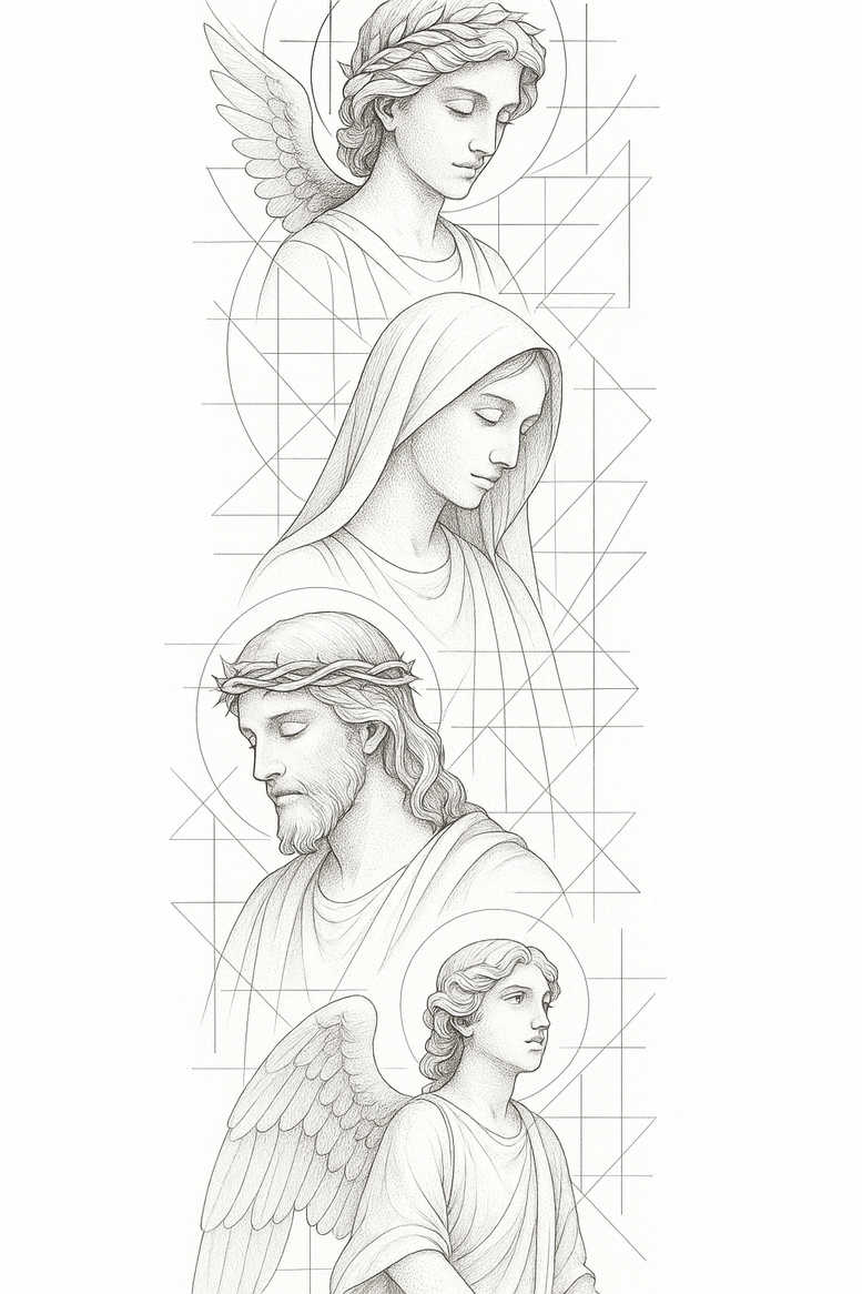 This AI-generated tattoo project concept presents a vertical quartet of serene angels, each with a halo and outstretched wings, positioned along a lattice of geometric lines. Executed in fine-line black and grey ink, the design relies on precise line weight, soft shading, and deliberate negative space to achieve a clean, timeless look that translates well at small and large scales. The upper figure’s gaze is inward, while the central figure is draped in a robe, and the two lower profiles are framed by circular halos that echo the surrounding geometry. Behind them, triangles, circles, and grid lines create a pattern that both grounds the composition and suggests order, balance, and interconnected guardianship. The overall effect is contemplative and modern: a traditional subject translated into contemporary linework, suitable for a back, sleeve, or leg piece, depending on scale. Each element carries meaning—the angels as protectors, the wings as freedom, the halos as sanctity—while the geometric network embodies structure and continuity, inviting personal interpretation about faith, guidance, and the passage of time. From a tattoo design perspective, the piece offers clean contours, crisp contrast, and graceful transitions between solid lines and negative space, characteristics that appeal to lovers of fine-line tattoo aesthetics and black-and-grey ink. For those seeking a meaningful tattoo with a classic motif and a fresh geometric twist, this concept provides a versatile template for a custom tattoo design, with the flexibility to add floral accents, infinity loop motifs, or Japanese-inspired spacing if desired. While the arrangement is intricate, the composition maintains legibility at modest sizes, ensuring that the imagery remains recognizable on forearms, calves, or shoulders, and the modular nature of the grid allows for seamless expansion or integration with existing ink. This is an AI-generated tattoo project, illustrating how traditional sacred imagery can be reimagined through disciplined linework and pattern-focused composition, yielding body art that is both timeless and contemporary.