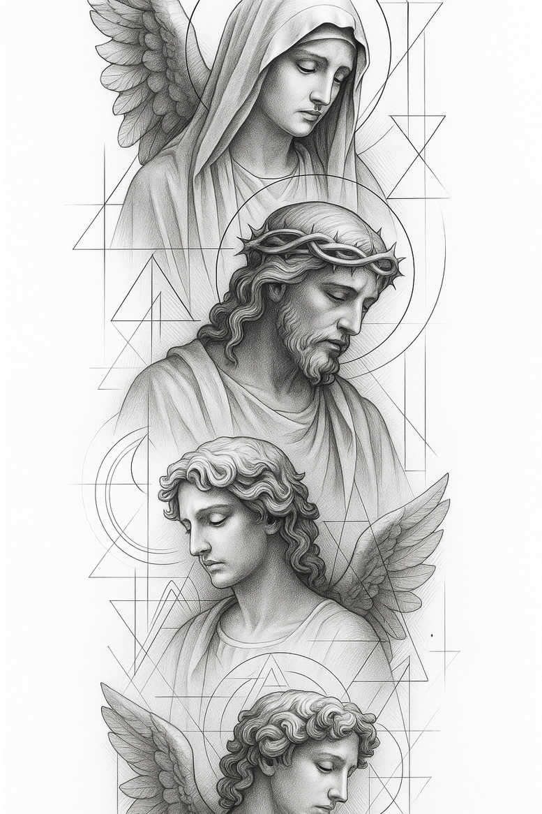 This is an AI-generated tattoo project presenting a vertical, sacred-geometry composition of four figures—an angel at the top, a central figure of Jesus with a crown of thorns, a serene female figure, and a lower winged apparition—rendered in precise fine-line shading on black and grey skin tone. The artwork fuses classical sculpture-inspired portraiture with geometric scaffolding: interlocking triangles, circles, arcs and straight lines weave behind and around the figures, functioning as both framing device and symbolic lattice. The top angel gazes downward with a calm, protective expression; the central Jesus posture is pious and introspective, the crown of thorns rendered in crisp line work; the female figure below appears in quiet contemplation, while the bottom angel returns the viewer’s gaze with wings implied by negative space. The pencil-like shading and soft gradations create depth and lifelike volume, while the geometry provides a modern, architectural counterpoint that resolves into a cohesive composition. This design reads as a large-scale back, chest, or sleeve piece in a fine-line black-and-grey palette, where negative space and line weight play a critical role in readability on skin. Symbolically, the composition speaks of protection, sacrifice, serenity, and guidance, with eternity motifs implied by circles and balance signified by geometric symmetry. As an AI-generated tattoo project, it demonstrates how digital planning can harmonize narrative subject matter with precise line work, offering a meaningful tattoo concept for clients seeking a bold but refined piece.