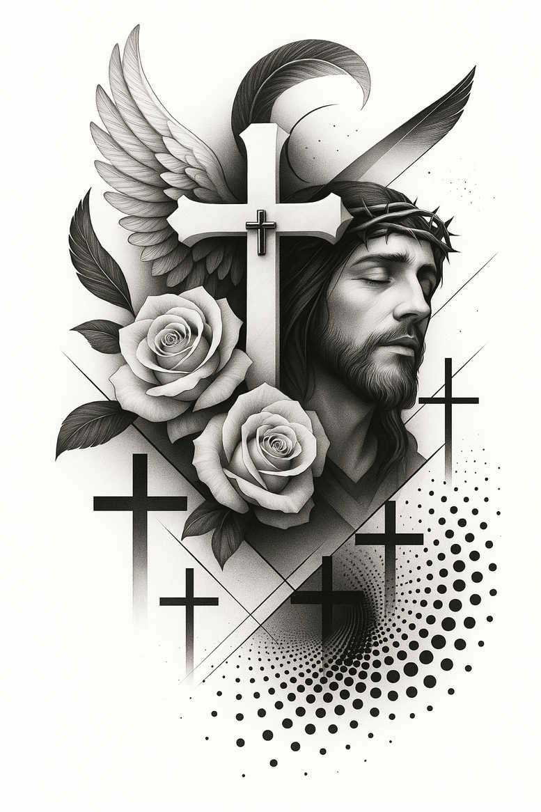 This AI-generated tattoo project presents a black and grey composition fusing sacred symbolism with contemporary geometry. The central cross is rendered with bold, clean lines, flanked by wings that cradle a contemplative face, echoing traditional religious imagery. A crown of thorns sits above the head, reinforcing themes of sacrifice and faith, while two roses provide life and memory through delicate shading. Geometric lines intersect the piece and a halftone dot pattern radiates outward, giving the design a modern edge suitable for large placements or a cover-up. The portrait-like face is rendered with subtle light and shadow, allowing a skilled artist to preserve detail in black and grey ink while maintaining legibility with aging. The combination of realism and graphic elements creates a versatile template for personal meaning, appealing to those seeking a rose tattoo design or a faith-inspired motif reimagined in a contemporary style. For cover-up potential, the dark zones offer strong concealment opportunities while accommodating new lines and shading that evolve with the wearer’s skin. This concept illustrates how AI previews can inform a custom tattoo design workflow, enabling placement and scale exploration before committing to ink. Key elements to tag are cross, wing, face, rose, crown, line, and dot; the style is black and grey realism, and the pattern is reinforced by geometric halves and halftone shading. The subject carries symbolism of faith, protection, mortality, and renewal, making it a meaningful tattoo choice within black and grey body art and fine line tattoo traditions. It works well for meaningful tattoos, small or large pieces, and as a strong cover-up option.
