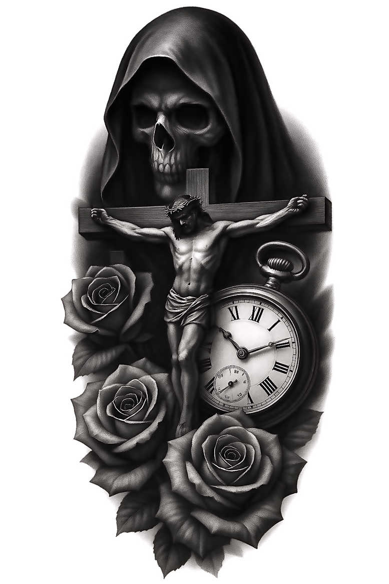 This grayscale composition centers a crucifix bearing Jesus as the anchor, while a hooded figure lurks in the shadow behind it, lending a Gothic gravitas. To the right rests a pocket watch with clear Roman numerals, suggesting time paused at a significant moment; at the base and sides, roses bloom with meticulous shading and delicate petal edges, anchoring the composition with natural, organic form. Rendered in black and grey, the artwork uses smooth gradient transitions, fine line work, and careful contrast to sculpt each element into a cohesive three-dimensional silhouette suitable for a large skin canvas such as back, chest, or sleeve. The cross provides a strong vertical axis, the hooded figure introduces tension and narrative, the watch introduces time as a symbol of mortality, and the roses soften the scene with a message of beauty and endurance amid darkness. The design communicates themes of life, death, memory, and faith, making it a meaningful tattoo design for those who seek personal symbolism; it also aligns well with rose tattoo design and realistic tattoo aesthetics, while staying adaptable for small or medium pieces through selective scaling of individual motifs. For cover-up purposes, the dense grayscale shading and overlapping forms can effectively obscure previous tattoos, particularly dark ink, making this concept ideal as a cover-up tattoo project. Note: this is an AI-generated tattoo project concept intended to inspire a custom tattoo design; a professional artist should finalize line weight, shading, and placement for optimal skin integration.