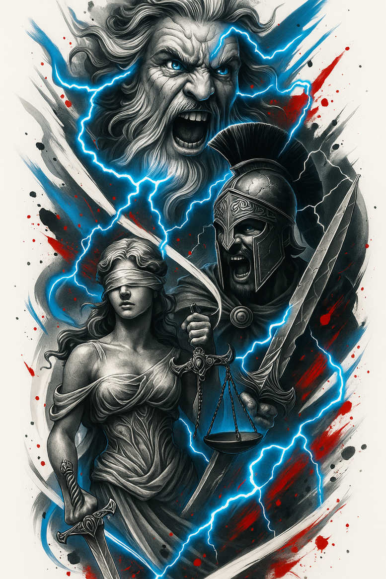 AI-generated tattoo project presented as a large, high-contrast black and grey composition that blends mythic drama with judicial symbolism. In grayscale, three figures emerge through electric blue lightning: an imposing elder, a blindfolded woman with a sword and scales, and a knight in ornate armor brandishing a blade. The scene relies on dense cross-hatching, smooth gradients, and painterly brushwork to achieve a realistic yet illustrative feel suitable for skin, where blue bolts weave between robes and metal to unify foreground and background. Red blood-splatter accents punctuate the composition, injecting energy and danger and forming a graphic pattern against the cool greys. The composition uses bold negative space and strong tonal shifts to create a legible silhouette that translates well as a tattoo design on a large surface such as a back or sleeve. Symbolically, the trio represents power, justice, and protection; lightning connotes fate and crisis, while the scales symbolize balance and accountability. From a tattoo perspective, the piece offers versatile options: crisp linework for fine line tattoo accents, or broader black work for a dramatic monochrome piece. Because of its density and depth, it is particularly well suited as a cover-up, as the intense blacks and layered grey tones help mask older ink while providing a strong foundation for new imagery. This project is an AI-generated tattoo concept intended to inspire bespoke tattoo design discussions and showcase how dark, pattern-rich imagery can translate across styles—black and grey realism, graphic noir, and traditional-inspired silhouette work. Keywords include tattoo, tattoo design, meaningful tattoos, fine line tattoo, lotus flower tattoo, infinity tattoo, tribal tattoo, rose tattoo design, small tattoos, flower tattoos, custom tattoo design, Japanese style tattoo, black and grey, realistic tattoo, body art, ink.