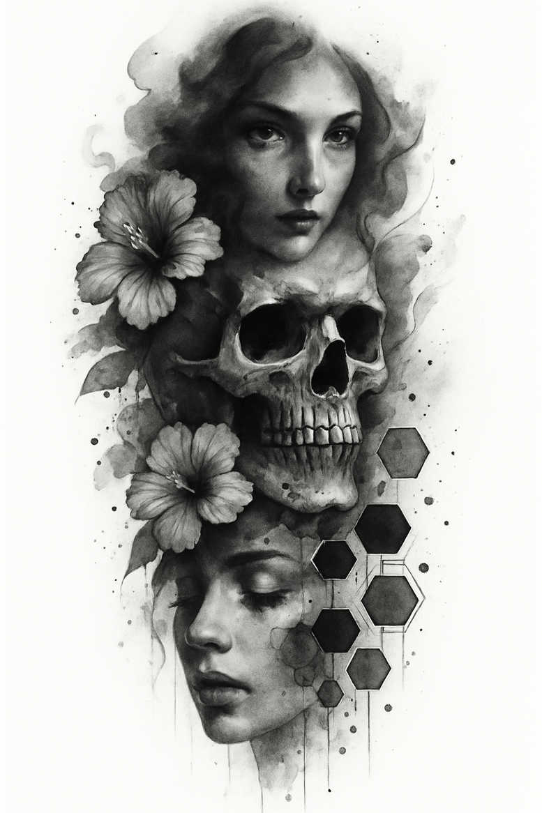 AI-generated tattoo project concept. A dark, black-and-grey composition that stacks a skull between two female faces, with hibiscus blooms and a hexagonal honeycomb pattern. Rendered in a realist grayscale style, it relies on soft gradients, subtle cross-hatching, and deliberate negative space to create depth and mood. The central skull anchors the design, its hollow eye sockets and serrated teeth treated with meticulous shading, while the two profiles rise and fall along the sides, their expressions calm and introspective. Hibiscus blossoms weave through the composition, lending organic curvature that contrasts with the geometric hexagons cascading along the right edge; the hex pattern introduces a contemporary element while echoing themes of structure and connectivity. Drips and splashes of ink give a watercolor-like feel, blurring the lines between figure, flora, and form. This tattoo design is well-suited for a sleeve, back, or chest placement, and its strong contrast and structured geometry make it a top choice for a cover-up, especially on darker skin tones where shade can be intensified to conceal prior marks. The piece invites interpretation about mortality, beauty, and the interplay between nature and geometry, making it a meaningful tattoo for someone seeking a powerful, visual narrative. If pursued as a small tattoo configuration, the key motifs— skull, hibiscus, and hex pattern — can be scaled down while preserving impact. As an ink-based body art concept, it aligns with categories like black and grey, realistic tattoo, floral tattoo design, and pattern-driven composition, while offering paths toward a Japanese-inspired or fine line approach depending on client preference. This concept showcases how a tattoo design can fuse life and death motifs with architectural geometry, resulting in a striking, cover-up-friendly piece that remains legible and evocative over time.