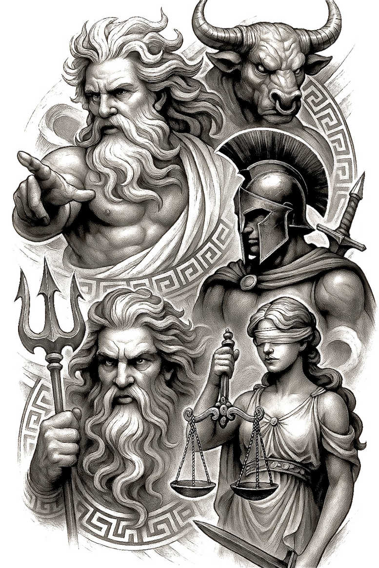 A detailed black and grey tattoo composition presents a mythic assembly of ancient symbols and deities in a bold, scalable format suitable for a back piece or chest panel. Foregrounded is Zeus, the stern, bearded ruler who points with authority, while a bull head looms behind him, reinforcing raw primal power. To the right stands a helmeted warrior, his Spartan crest and armor rendered with precise shading to convey metallic texture and strength. A circular backdrop bearing a Greek key pattern encloses the figures, unifying the scene with a classical motif. In the lower left, an elderly man with a long beard grasps a trident, a symbol of sovereignty and the sea; across from him, a blindfolded Lady Justice lifts the scales, an emblem of balance and law. A diagonal blade crosses the composition, adding tension and suggesting ongoing conflict. The piece relies on strong line work and smooth black and grey gradations to render anatomy, drapery, and metal surfaces with a convincing sense of depth. Symbolically, the work juxtaposes divine rule, martial prowess, and moral order, inviting interpretation about power, justice, and destiny within a mythic narrative. The shield’s geometric pattern supplies a graphic contrast that photographs well in tattoo form, while the overall darkness of the piece makes it particularly well-suited for cover-up applications where existing ink is darkened or complex. This project is presented within an AI-assisted concept workflow, illustrating how AI-generated tattoo projects can expand traditional mythic themes into refined, contemporary designs. It aligns with keywords such as tattoo design, meaningful tattoos, black and grey, realistic tattoo, and ink, while remaining flexible for variations in size and placement to suit client preferences. The composition embodies a timeless mythic dialogue, inviting clients to explore symbolism, power, and justice through a meticulously crafted black and grey ink study.