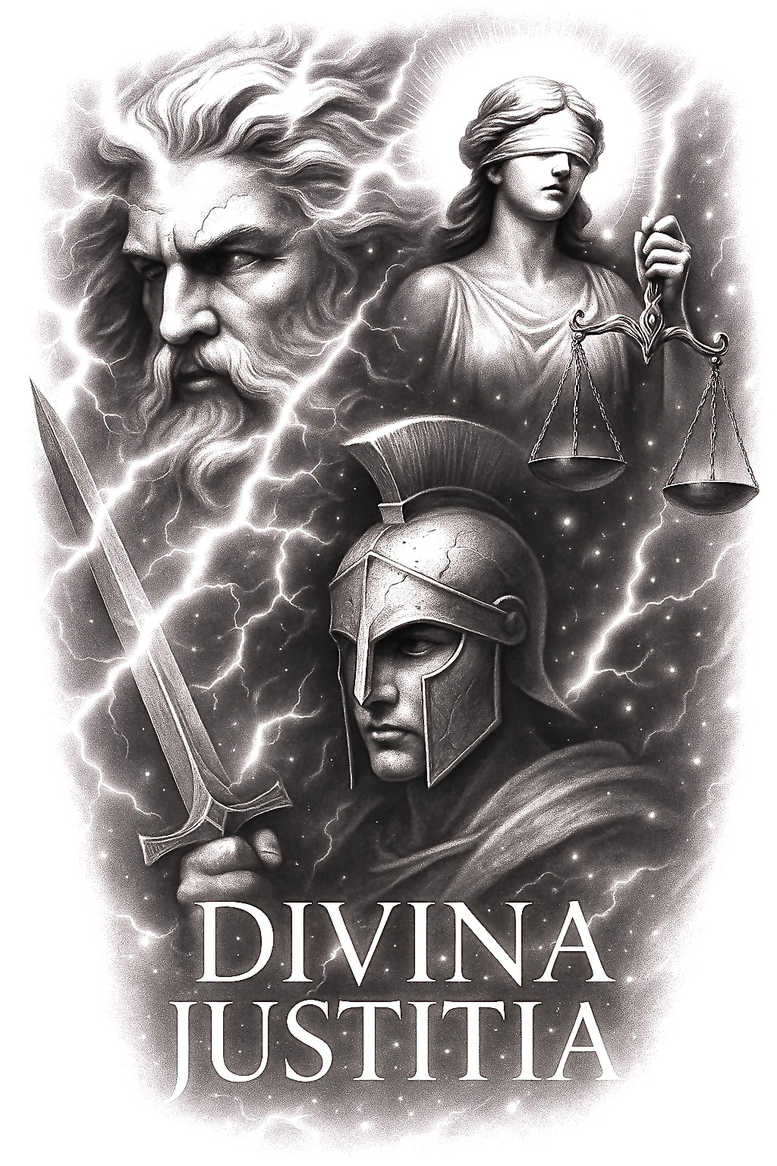 AI-generated tattoo project presents Divina Justitia as a dramatic grayscale composition for a large-scale tattoo. The primary focal point is a stern armored knight with a gleaming helmet and a thrusting sword, juxtaposed with a serene blindfolded Justice figure who holds a delicate balance. Surrounding them are jagged flashes of lightning and a billowing cape, all rendered in dense black and grey shading to emphasize contrast, motion, and symbolic tension between law and fate. The text Divina Justitia appears at the base, grounding the piece in classical iconography while the storm imagery heightens the sense of judgment. The design uses weighty negative space and subtle gradations to create cohesion across a back, chest, or sleeve, with bold silhouettes that read clearly from a distance yet reward close inspection with micro-detail in the linework. The helmet, sword, and armor offer strong geometric anchors, while the balancing scales provide a counterpoint of symmetry and grace. Lightning serves as an energy conduit that unites the figures and creates dramatic lighting opportunities for black and grey realism, allowing smooth blends from inky deep blacks to lighter midtones. This tattoo design invites a narrative interpretation of justice, courage, and accountability, making it suitable for meaningful tattoos and custom tattoo design projects. As an AI-generated tattoo project, it demonstrates how classic allegory can be translated into modern ink through fine line touches, bold block shading, and careful feathering of transitions to preserve readability as the skin ages. For practitioners, the piece is ready for adaptation to cover-up work—its dense shadows and strong outlines can effectively mask older ink while preserving the subject’s clarity. In portfolio terms, it supports keywords such as tattoo design, black and grey realism, meaningful tattoos, and ink-ready composition, with potential extensions into related motifs like infinity or rose tattoo design if desired by the client.