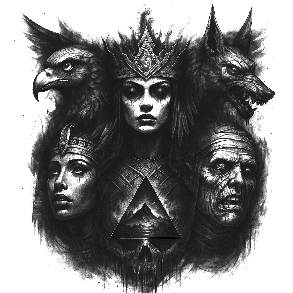 AI-generated tattoo projects explore a dark, mythic ensemble in black and grey, anchored by a central crowned queen. The composition places an eagle to the left and a wolf to the right, with a weathered skull beneath and a female warrior head on the lower left, creating a vertical, almost heraldic axis. A crown sits atop the queen, while a triangle motif bearing a rugged mountain scene anchors the center, providing a geometric counterpoint to the organic forms. The shading is meticulously rendered with fine line work, cross-hatching, and subtle fades to produce a realistic tattoo aesthetic, suitable for large-scale placements such as the back, chest, or sleeve, yet refined enough for smaller iterations in fine line tattoo terms. The black and grey palette emphasizes volume, texture, and mood, enabling dramatic contrast without color. The design nods to Japanese style tattoo influence through its composition and symmetry while embracing Western warrior and mythic iconography. Meaningfully, the elements speak to protection, ascent, and mortality—the eagle and wolf as guardians, the queen as sovereign, the skull as reminder of impermanence, and the mountain within the triangle as a symbolic sanctuary. For artists, the piece offers flexibility: thickness of lines, level of detail, and background shading can be adapted to a customized tattoo design, including the possibility to integrate lotus flower tattoo or rose tattoo design accents if desired. This is a bold, cinematic tattoo concept that works as a stand-alone piece or a powerful starting point for a larger body of work. Because the image is very dark, it is particularly well-suited as a cover-up project for concealing existing ink or scars, and its AI-generated origin ensures consistent reproduction across canvases.