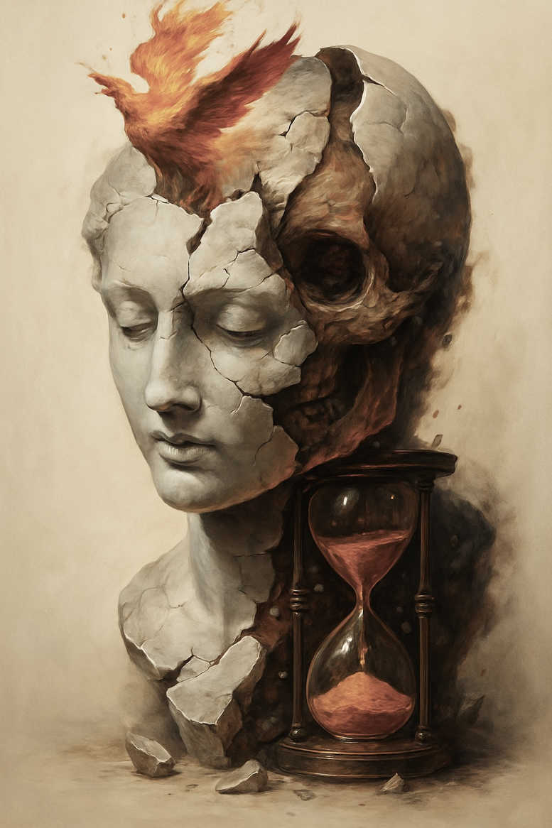 An AI-generated tattoo project presented as a surreal study in sculpture and time. The central image is a classical bust rendered in black and grey tones, its marble planes fractured by deliberate cracks that dissolve into fragments along the neck and jaw. A second element, an hourglass, sits to the right with glass catching a soft pink sand that hints at the passage of time. From the crown of the head a flame erupts in warm amber and orange, providing a counterpoint to the stern grayscale surface and binding the composition with kinetic energy. The piece reads as a tattoo design that could translate to skin with careful shading, stippling, and blending to achieve painterly realism. The cracked pattern across the head functions as a graphic motif, guiding the eye and suggesting memory, decay, and renewal. The contrast between the cool, stone-like textures and the fiery accent creates a dramatic rhythm that plays with light and shadow, a hallmark of black and grey realism and fine line tattoo technique. The hourglass anchors time as a motif while the bust evokes legacy and introspection; together they form a meaningful tattoo concept suitable for larger placements such as the back or chest. The use of negative space around the figure enhances legibility on skin, enabling a clean separation between the sculpture-like form and the surrounding environment. As an AI-generated tattoo project, this concept demonstrates how digital artistry can inform meaningful tattoos, offering a refined, customizable design that blends sculpture, symbolism, and ink into a cohesive body art statement. The design invites personalization: scale, line density, and the degree of crack pattern can be adjusted to suit individual stories while preserving the iconic balance of stone, time, and flame. Artists translating this concept into a tattoo would focus on achieving smooth transitions between the shaded marble surfaces and the crisp lines of the cracks, ensuring legibility when scaled down for smaller placements. The pink sand color anchor can be tuned to personal meaning, further strengthening the narrative of renewal through damage. This tattoo design embodies the idea of transformation, a meaningful choice for those seeking a memorable piece in black and grey realism, pattern-driven ink that remains legible across sizes and skin tones.
