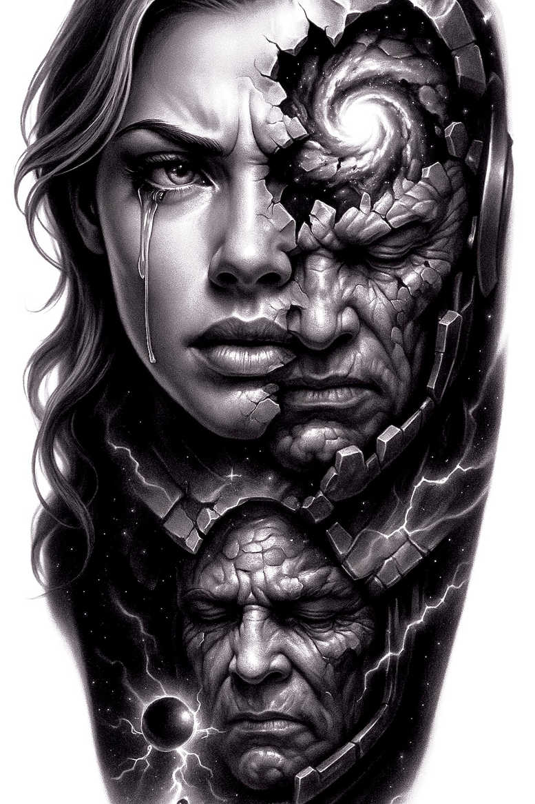 This high-contrast black-and-grey tattoo design presents a vertical split-portrait that fuses human warmth with machine precision. On the left, a finely rendered woman’s face emerges with soft shading, hair strands, and a teardrop that hints at vulnerability; on the right, a stone-cracked, circuitry-infused cyborg visage rises, its features defined by angular plates, jagged edges and electric veins that imply resilience and metamorphosis. The composition flows along the forearm or calf as a tall canvas, with careful negative space ensuring readability at multiple scales. The pattern of cracks, stone texture and geometric plating forms a graphic motif that reads boldly, a hallmark of a piece designed to function as a cover-up where older marks can be masked beneath the fragmented armor. Technical execution pairs realism with refined linework: smooth skin tones achieved through gradual grey washes, crisp edges for contour, and deep shadows to separate human warmth from synthetic cold. Symbolically, the blend of flesh and alloy speaks to dual identities, inner conflict, protection, and adaptation within the body art journey; it resonates with meaningful tattoos about renewal and the human-technology continuum. As a custom tattoo design, it invites personalization in scale, placement, and line weight, touching on preferences seen in fine line tattoo technique yet embracing broader shading akin to realistic tattoo styles. The AI-generated origin is acknowledged as part of the creative process, offering a modern starting point for a one-of-a-kind piece, while illustrating why such cover-up friendly projects are popular for large-format body art. In sum, this design harmonizes portraiture with graphic crack patterns and circuitry, delivering a striking black-and-grey narrative that suits black and grey realism lovers, Japanese style tattoo inflections, and tribal-leaning aficionados seeking a meaningful, transformative tattoo.