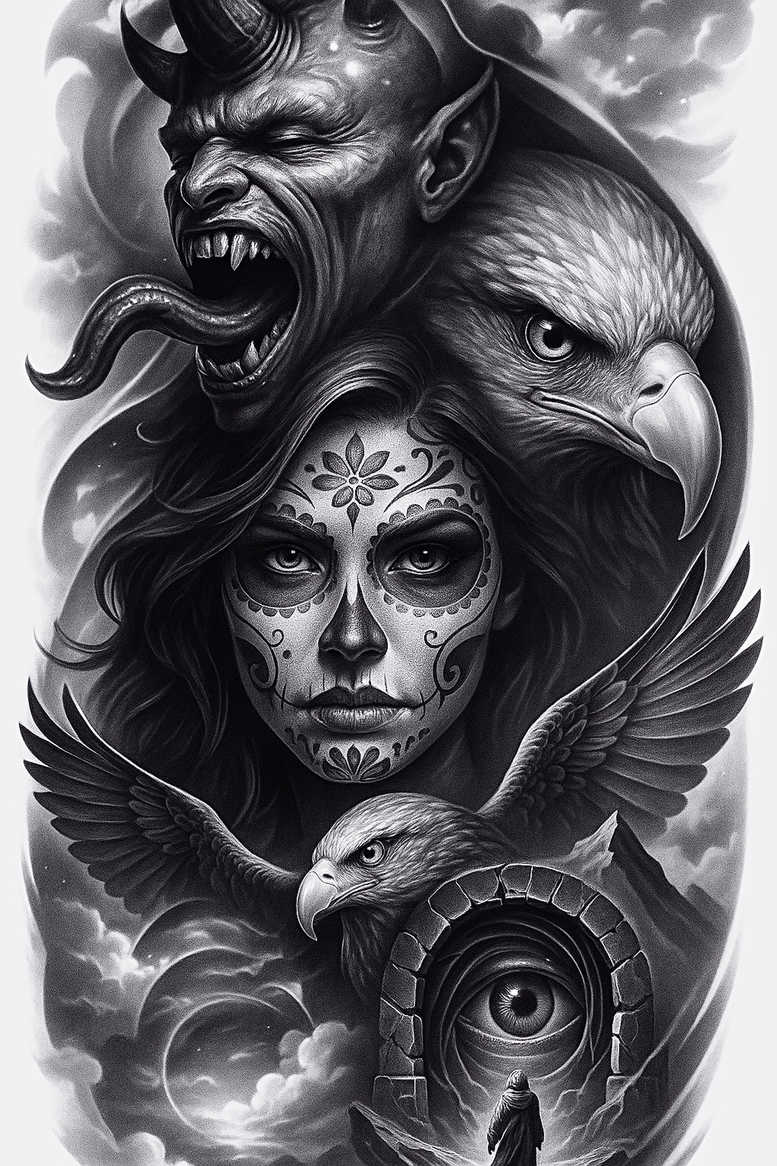 AI-generated tattoo project for this design, the piece presents a layered composition that fuses a female sugar skull portrait with a menacing demon and an alert eagle, all framed by a mystic portal. The central sugar skull features ornate floral accents on the forehead and cheek curves, with black-and-grey shading that defines the contours of the face and emphasizes the symmetry of the decoration. Behind the skull, the demon’s horned profile rises with menace, its features carved in high-contrast grayscale that blends with the woman’s gaze. To the right, the eagle’s head anchors the piece, its piercing eye and sharp beak rendered with meticulous feather texture and tonal gradation that conveys motion. Surrounding elements, including cloud-like shading and a circular arch leading to a gateway, provide depth and narrative momentum while maintaining cohesion. A smaller figure at the bottom, perhaps a cloaked traveler, stands before the arched portal, suggesting an invitation to a journey beyond the skin. The overall composition emphasizes contrast and form, leveraging black and grey values to create dramatic chiaroscuro. Symbolically, sugar skulls celebrate life and memory in Day of the Dead traditions, while the demon and eagle may symbolize dual forces of protection and danger, and the portal hints at crossing thresholds in personal transformation. For clients seeking meaningful tattoos, this is a bold, custom tattoo design that blends gothic and folkloric motifs, offering a realistic black-and-grey aesthetic that can age gracefully. It is also suitable as a cover-up due to its dense dark shading and complex motifs, allowing it to effectively obscure older artwork while preserving intricate details. These AI-generated tattoo projects sit at the intersection of technology and artistry, inviting tattoo artists to interpret the motif with precision and depth, while maintaining traditional craft and safety guidelines. The description naturally incorporates terms like tattoo, tattoo design, meaningful tattoos, fine line tattoo, lotus flower tattoo, infinity tattoo, tribal tattoo, rose tattoo design, small tattoos, flower tattoos, custom tattoo design, Japanese style tattoo, black and grey, realistic tattoo, body art, ink to maximize discoverability.