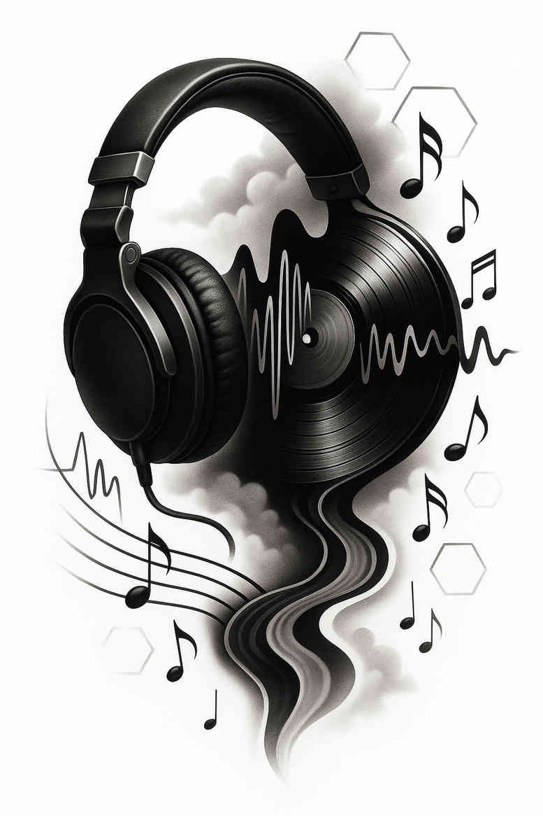 AI-generated tattoo project presents a bold concept that centers on an over-ear headphone silhouette with a vinyl disc at its core, from which curling soundwaves and smoke-like wisps flow downward. The headphones are rendered in solid black with smooth highlights, while the vinyl’s grooves anchor the central axis and transform into streaming ribbons of ink that cascade into abstract curves. Musical notes drift outward in composed clusters, their stems and flags tracing the motion of sound through space. A backdrop of soft clouds and subtle hexagonal motifs adds depth without crowding the foreground, creating a contemporary geometry that compliments the curvilinear linework. The piece relies on black and grey shading to achieve realism and dimensionality, allowing the hardware’s matte surfaces to contrast with glossy highlights and the vinyl’s circular geometry to repeat as a visual motif. Symbolically, the design speaks to the intimate relationship between music and personal memory, turning a common accessory into a portable story—an idea well-suited for meaningful tattoos and small-to-medium placements. For a tattoo design, this concept can be scaled to suit forearm, bicep, or shoulder canvases, with the central vinyl acting as an anchor while the waves wrap with the limb’s contours. In practice, the composition reads clearly from a distance and reveals intricate interior details on closer inspection, making it a flexible option for both fine line and bold graphic preferences within black and grey constraints. The work also aligns with trends in custom tattoo design, celebrating music culture through a modern, AI-generated approach while preserving timeless ink aesthetics and legibility over time.