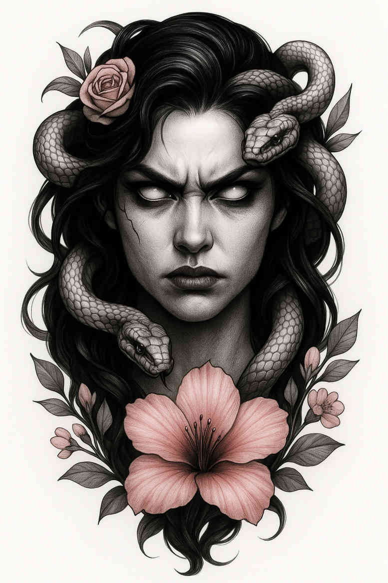 An AI-generated tattoo project concept rendered in a high-contrast, black and grey palette, this fine line design centers a resolute woman’s face as a guardian of wild nature. A sinuous snake coils around the crown of her head, its scales rendered with meticulous line work and subtle shading to convey motion and menace without breaking the composition. Nestled in the hair are two blooms: a pale-pink hibiscus that radiates soft warmth against the monochrome, and a smaller rose that hints at fragile beauty amid the intensity of the gaze. Leaves weave through the frame, balancing negative space and echoing organic growth. The overall aesthetic leans toward realistic tattoo execution, with careful rendering of textures—from the serpent’s scales to the woman’s lacquered lips and glossy hair—while preserving a refined, editorial quality suitable for a strong tattoo design. Symbolically, the serpent may signify transformation and resilience; the hibiscus evokes delicate strength; the rose stands for love and memory, while the intertwining flora suggests continuity and renewal. This concept merges traditional motifs—flower tattoos, snake tattoo symbolism, and portraiture—with modern linework to create a cohesive piece that works well as a standalone tattoo design or as a cover for existing marks. The work underscores the versatility of black and grey ink, with a restrained pink accent to highlight focal points. As an AI-generated tattoo project, it demonstrates how digital artistry can translate into meaningful tattoos, including potential variations in scale, placement, and line thickness, while remaining faithful to fine line tattoo aesthetics and the broader language of body art, ink, and design.