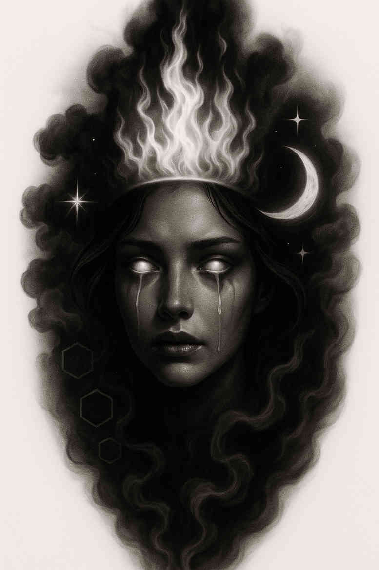 This AI-generated tattoo project presents a moody, monochrome portrait intended as a complete concept for a larger piece. A female visage emerges from a veil of dense smoke, her features defined by smooth black-and-grey shading that preserves soft transitions and subtle highlights. Atop her head a crown of flame rises in bright whites against deep shadows, creating a dramatic vertical focal point. To the right rests a slender crescent moon, while scattered stars punctuate the dark field, adding celestial symbolism and contrast. Her eyes appear blank, with delicate teardrops tracing the cheeks, infusing the design with sorrow that hints at resilience and memory. On the lower left, geometric hexagons anchor the composition, providing a modern counterpoint to the organic swirls of smoke and hair. The overall flow uses negative space to guide the eye from crown to chin and along the neck, making it highly adaptable to a back, shoulder, or chest canvas. The palette emphasizes black and grey, with crisp lines and a bold value range that yield strong readability on skin and make the piece suitable for a cover-up over existing ink. While designed as a standalone motif, the concept scales gracefully, allowing adjustments to density, line weight, and composition to suit body contours and personal meaning. Symbolically, flame stands for transformation, the moon for cycles and mystery, tears for endurance, and hexagons for structure—together, they form a tattoo design with meaning that remains powerful in minimal form or expanded detail. This AI-generated tattoo project demonstrates contemporary realism-infused approaches to body art and is especially effective as a cover-up option, with room to tailor size, shading, and placement to individual preferences.