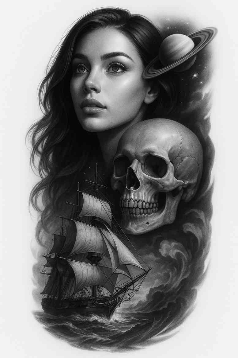This AI-generated tattoo project showcases an intricate black and grey design that beautifully combines elements of a woman, a skull, and a ship, making it a perfect choice for those seeking a meaningful tattoo or a cover-up. The detailed portrayal of the woman, with her flowing hair and serene expression, symbolizes strength and femininity, while the skull represents mortality and the transient nature of life. The ship, navigating through turbulent waters, signifies adventure, exploration, and the journey of life itself.