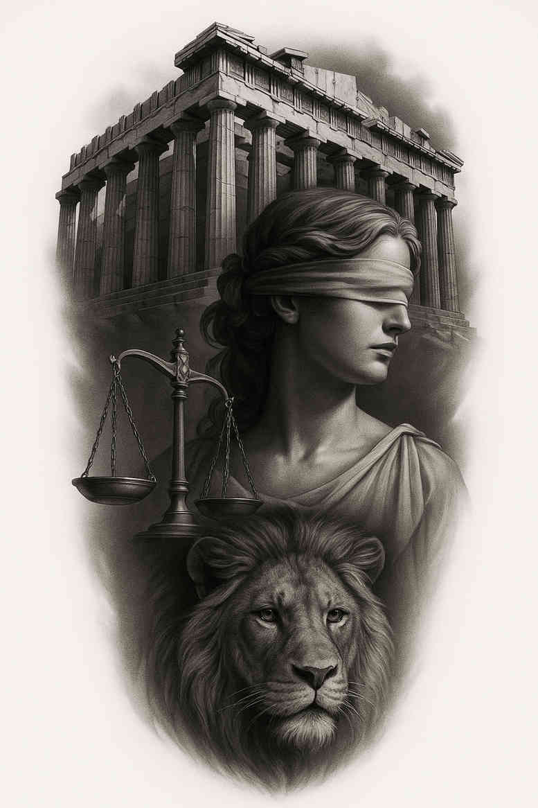 This AI-generated tattoo project showcases a stunning representation of Lady Justice, intricately designed with a blindfold, symbolizing impartiality and fairness. The tattoo features a majestic lion, embodying strength and courage, alongside the iconic scales of justice, which represent balance and equality. The detailed black and grey shading adds depth and realism, making this piece not only a work of art but also a meaningful tattoo that resonates with those who value justice and integrity.