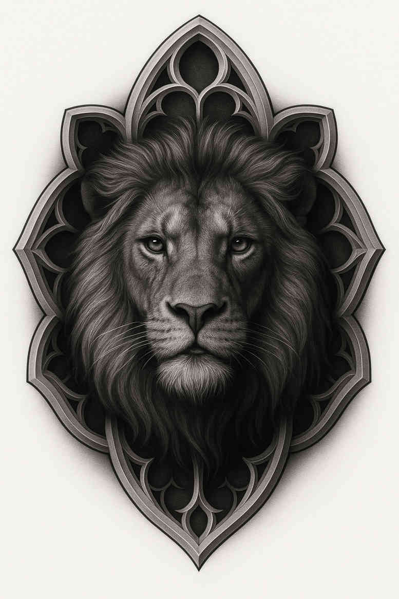 This AI-generated concept presents a commanding lion head rendered in black and grey shading, set within an ornate Egyptian frame that nods to Anubis-inspired iconography. The composition centers on the lion’s dense mane and focused gaze, with subtle cross-hatching and smooth gradient transitions that create a lifelike sense of depth while the surrounding frame interlaces repeating geometric and floral elements. The juxtaposition of raw animal power with sacred ancient Egyptian design conveys protection, strength, and guardianship, aligning with the mythic role of Anubis as guide to the afterlife. From a tattoo design perspective, the piece leans toward realistic shading and bold linework, offering a strong focal point that suits larger placements such as the shoulder, chest, or back; the black and grey palette emphasizes contrast and texture, and the ornate frame provides ceremonial context without overpowering the central figure. The repeating ornamental motifs give a rhythmic pattern that enhances visual cohesion, making it an excellent standalone tattoo design or a complementary component in a sleeve. For those seeking meaningful tattoos, the symbolism of Anubis paired with the lion’s authority evokes courage, protection, resilience, and devotion to heritage. Because of the dense ink areas, this design is also well suited for cover-up work, allowing existing tattoos to be obscured cleanly while maintaining the new artwork’s integrity. The concept demonstrates a refined balance between bold silhouette and intricate engraving, reflecting a custom tattoo design approach that honors myth and power while remaining versatile for various skin tones and sizes. In short, this Anubis-inspired lions head tattoo design fuses mythological symbolism, animal prowess, and Egyptian ornament into a timeless body art statement that appeals to enthusiasts of black and grey realism, sacred iconography, and geometric patterning, while also serving as a potential centerpiece for a larger composition. Careful consideration is given to line density to ensure longevity and clarity, with the mane built from layered strokes to mimic natural texture and the frame employing a repeating teardrop motif that reinforces a classical Egyptian aesthetic. The ink density can be adjusted for lighter skin tones or strengthened for darker skin, making it adaptable for different bodies and scales. This is a strong option for meaningful tattoos that celebrate heritage, myth, and power within a single striking image.