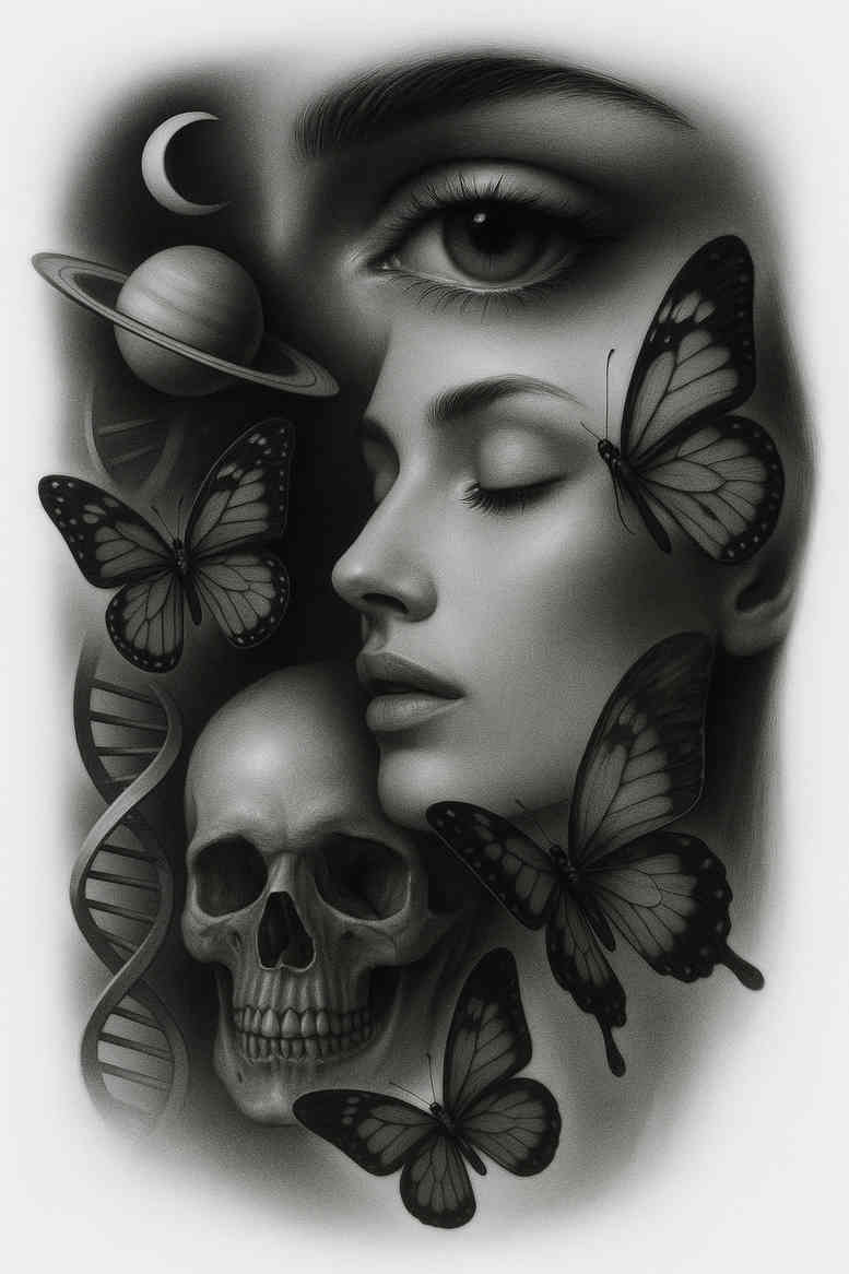 AI-generated tattoo project exploring the intersection of life, death, and transformation in a single, evocative composition. The central portrait of a serene face anchors the piece, its grayscale shading rendered to a photorealistic quality that suits a variety of body locations, from chest to back. A skull sits near the lower left, grounding the piece in mortality, while a cluster of butterflies dances around the cheek and jaw, signaling rebirth and metamorphosis. A DNA double helix winds along the left edge, symbolizing genetic memory and the continuity of life. Above, Saturn with rings and a crescent moon drift toward the upper left, evoking cosmic cycles, time, and mystery. The composition relies on soft gradients and fine line work to create a cohesive, dreamlike atmosphere; the elements can be separated or merged in tattoo layouts for a small tattoo or a larger panel. The symbolism blends mortality, transformation, and the microcosm of nature with the macrocosm of the cosmos, inviting contemplation of meaning and personal narrative—perfect for meaningful tattoos, or lotus flower, infinity, or tribal-inspired themes in black and grey. The piece nods to Japanese style tattoo sensibilities through its naturalistic shading and balanced composition, while maintaining a contemporary surreal vibe and the possibility of a realistic ink finish. For practitioners, the design supports a refined, fine line tattoo approach around the butterflies and features a strong central portrait; it also accommodates a bold, large-scale look with heavier shading to emphasize contrast. Given its heavy motif and dark tonal range, the project is especially well suited as a cover-up, offering a fresh, intricate canvas that can mask previous imagery while creating a new, expressive story on the skin. As an AI-generated tattoo project, it demonstrates how digital concepts can translate into commission-ready body art, delivering a cohesive narrative, strong visual impact, and suitability for a wide range of placements; the final tattoo design will rely on black and grey inks for depth, with occasional pure black accents to sharpen edges and ensure longevity.
