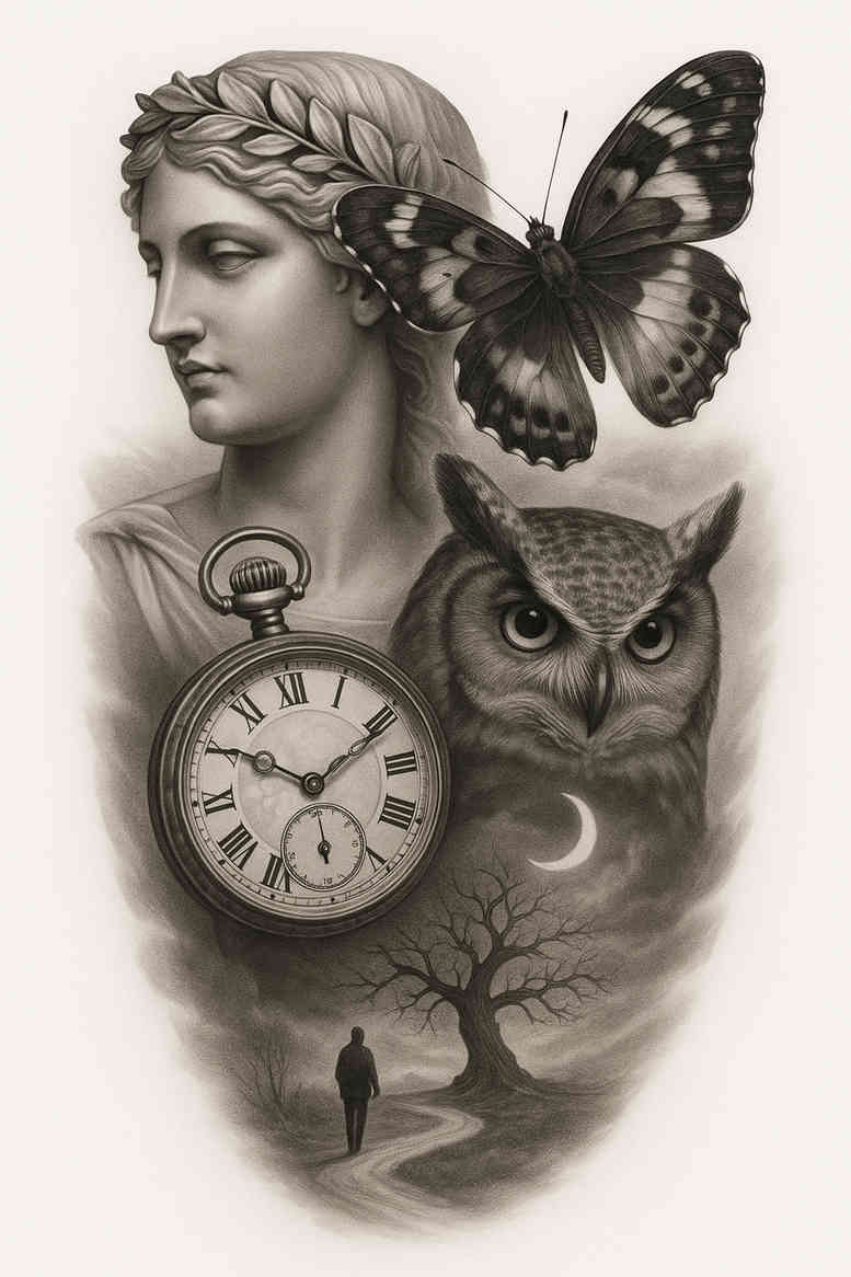 This AI-generated tattoo project presents a grayscale, fine-line composition that blends classical sculpture with nature and the passage of time. The focal point is a profile of a statue head with a laurel crown, drawn in precise line work and soft shading to convey calm monumentality. Above it, a butterfly with delicate veining illustrates motion and metamorphosis, while an attentive owl sits nearby, its gaze steady and wise. A vintage watch hangs at the chest level, its Roman numerals anchoring the scene in a timeless mood. A stark, leafless tree stretches across the lower portion, its branches curling toward a crescent moon, and a winding path leads a lone figure into an undefined horizon. The composition weaves together themes of mortality, wisdom, transformation, and journey—rich territory for meaningful tattoos and fine line tattoo approaches. Executed in black and grey ink, the piece relies on restrained contrast and meticulous detailing to achieve depth without color, making it suitable for both small tattoos and larger canvases. Given its density and mood, the design is also an excellent candidate for a cover-up, with layered shading able to mask older ink while preserving the new lines. Artists may emphasize the laurel and wings with crisp edges, while the watch dial receives subtle stippling to resemble antique engraving. This concept complements the vocabulary of tattoo design, body art, and Japanese style tattoo aesthetics, and it can be adapted to personal symbolism—time, memory, metamorphosis, and path—ensuring a timeless result for ink collectors and first-timers alike. In short, it is a refined, versatile tattoo design that blends realism with myth and meaning, ideal for those seeking a impactful cover-up or a standout standalone piece.