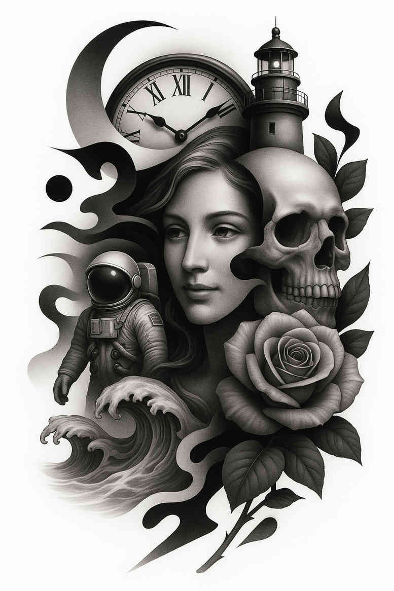 This grayscale composition blends surreal symbolism with restrained portrait realism to form a cover-up-friendly tattoo design. At the center, a calm, softly shaded woman’s visage anchors the piece, while a skull and a blooming rose occupy adjacent focal points, their contrasts evoking life and mortality. Behind and around them rise a lighthouse, an ornate clock, and curling ocean waves, with a solitary astronaut drifting through the scene—an invitation to personal exploration and memory. Leaves frame the imagery, creating a sense of growth and continuity as the narrative unfolds across skin. The artwork is rendered in black and grey, with carefully calibrated gradients, crisp line work, and smooth transitions that preserve legibility on larger panels yet translate well into smaller amplifications. The clock acts as a reminder of time’s inexorable passage, the skull a memento mori, and the rose a symbol of beauty enduring within darkness. The astronaut and the sea introduce a contemporary, dreamlike quality, suggesting voyages into the unknown and resilience in the face of uncertainty. The lighthouse provides a beacon, guiding the wearer through past and future ink, while the composition’s negative space anchors the design so it remains clear and readable as a cover-up for older tattooed areas. As an AI-generated tattoo project concept, this piece demonstrates how disparate motifs can be harmonized into a cohesive narrative while maintaining versatility for alternative placements, sizes, and styles. It sits squarely in the realm of tattoo design, black and grey realism, meaningful tattoos, and fine line accents, offering both a bold statement and a timeless, personal symbol. Overall it’s a sophisticated study in monochrome storytelling, inviting interpretation of mortality, memory, travel, and growth—the kind of tattoo design that ages gracefully on the skin.