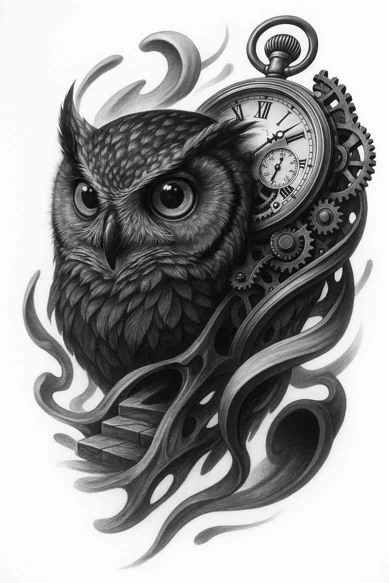 This AI-generated tattoo concept blends the nocturnal wisdom of an owl with the precision of a vintage pocket watch, rendered in a refined black and grey palette. Executed in a fine line, illustrative style, the piece emphasizes delicate linework, smooth gradients, and subtle shading to bring depth to every feather and gear. The central owl sits alert and majestic, its large eyes and textured plumage crafted with meticulous detail, while a pocket watch peeks from behind, its face partially hidden by the bird’s wings. Flowing swirls and discreet gear motifs weave around the composition, uniting organic and mechanical elements into a single, cohesive motif. The design hints at time, memory, and fate, inviting the observer to consider moments that pass and the wisdom that endures. With strong contrast and a carefully balanced composition, this concept is highly adaptable to different body areas, from the shoulder to the forearm, and is particularly well-suited as a cover-up due to its dense shading and negative space interplay. As a purely AI-generated concept, it demonstrates how technology can inspire tattoo design while maintaining a professional magazine-level presentation. The piece delivers a complete narrative: an emblem of wisdom (owl), a symbol of time (pocket watch), and a set of ornamental lines that unify the scene into a sophisticated body art statement. It remains faithful to a traditional black and grey look, while embracing fine line technique and modern linework details common in contemporary tattoo design. This project is ideal for a meaningful tattoo, a small-to-medium piece with timeless appeal, and a compelling option for a custom tattoo design. It’s a strong candidate for a cover-up, offering depth and texture that can effectively mask older ink while preserving a striking focal point. Note: this is an AI-generated concept for a tattoo project, illustrating how digital creativity can translate into real-world body art. Keywords include tattoo, tattoo design, meaningful tattoos, fine line tattoo, lotus flower tattoo, infinity tattoo, tribal tattoo, rose tattoo design, small tattoos, flower tattoos, custom tattoo design, Japanese style tattoo, black and grey, realistic tattoo, body art, ink.
