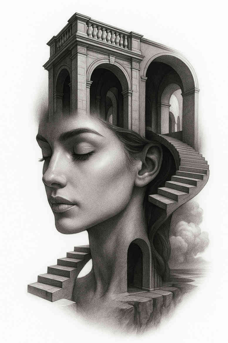 This AI-generated tattoo project presents a black and grey fine line portrait that weaves human emotion with architectural imagery. The central motif is a restrained grayscale portrait of a calm female face, rendered with meticulous linework and smooth shading to achieve a lifelike feel. Framing the head, an arch doorway suggests a gateway into memory, while a spiraling staircase wraps around the neck and shoulder, infusing the piece with motion and ascent. The design relies on controlled contrast, delicate micro-lines, and soft gradient transitions to maintain legibility from a distance while rewarding close inspection. The overall aesthetic blends realism, surrealism, and architectural symbolism—rooted in traditional black and grey portraiture yet amplified by contemporary fine line techniques. This is an AI-generated tattoo project created as a concept for a bold cover-up or a large-scale body art piece, especially suited to dense grayscale shading and strong silhouettes. The arch and stairs carry rich symbolism: opening a new chapter, climbing toward personal truth, and moving through memory. In a magazine-grade voice, the piece is framed as a thoughtful study of line, shade, and symbol, appealing to collectors who value narrative ink. Importantly, this is an AI-generated concept, illustrating how technology and artistry collaborate to expand tattoo ideation. If you’re considering a cover-up, the design’s density and bold silhouette offer strong tonal balance to camouflage older work while presenting a fresh, expressive image. This project reads differently from afar and up close, inviting both casual admiration and deeper reflection, making it a compelling entry for any creative portfolio.