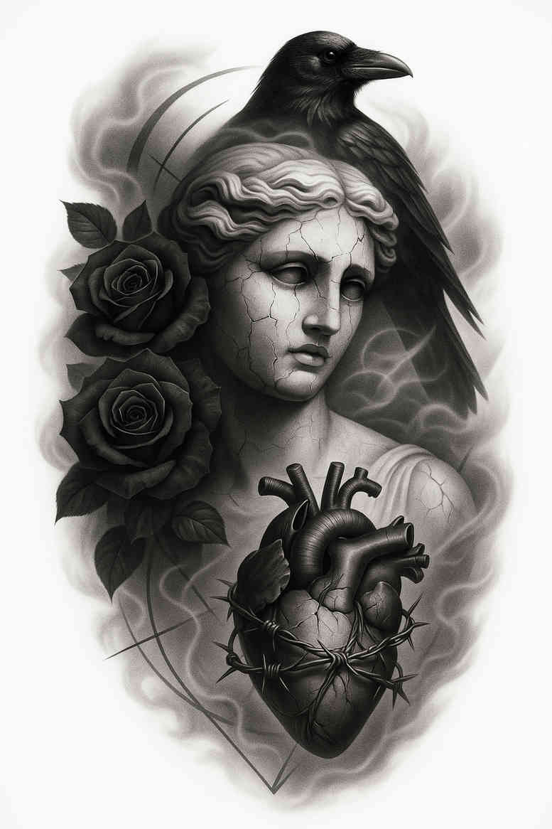 This AI-generated tattoo project presents a dramatic black and grey tribute to beauty and resilience. Executed in a refined fine line style, the composition centers on a female portrait framed by a cascade of roses. The upper portrait is rendered with delicate, hairline strokes, building soft shading to convey facial contours, expression, and depth without heavy saturations. Surrounding the head, a bouquet of roses provides contrast and texture; each petal is outlined with subtle lines to create a lifelike yet ethereal feel. The lower portion features a dark heart held by a skeletal hand motif, entwined with additional shading to emphasize a Gothic mood and to anchor the piece. The entire composition relies on smooth gradations of black and gray ink, allowing for a cohesive flow from the face to the floral elements and the symbolic heart motif. The artist notes that this is an AI-generated tattoo concept, offering a fresh approach to traditional motifs while maintaining a grounded feel. Symbolically, the female portrait conveys inner strength, wisdom, and grace; the roses symbolize love, beauty, and growth; the heart-hand motif introduces a reminder of courage and vulnerability, suggesting a narrative of giving and receiving emotional risk. The design nods to classic Japanese influenced lines and western romantic imagery, combining delicate fine line work with bold contrast to create a balanced composition that can be adapted for a larger sleeve or a striking back-piece, as well as a smaller piece. Because the composition darkens toward the bottom with the heart and hand, the piece is particularly well-suited for a cover-up if needed, which is also a nod to the project ability to transform existing ink into a fresh statement. This topic area is part of an ongoing exploration of AI-generated tattoo concepts, a growing field where technology intersects traditional artistry. In terms of technique, the design uses fine line work, controlled shading, and stippling for texture. The black and gray palette emphasizes mood and atmosphere, while the roses provide a natural counterbalance to the intense heart motif. The resulting image is a versatile tattoo idea that can be adapted to Japanese-inspired or more contemporary interpretations, depending on client preference. Note that this is an AI-generated concept intended to inspire real-world tattoo work and can be refined by a professional artist. The project explores the tension between delicacy and darkness, producing a powerful visual narrative that remains legible at smaller sizes and scales well to larger canvases. It is explicitly described as an AI-generated tattoo concept for a modern magazine editorial feature, and it is designed with cover-up potential in mind.