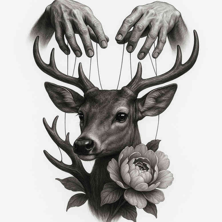 This grayscale marionette-themed deer portrait blends realism with symbolic flair in a black and grey palette. The central deer head and broad antlers anchor the composition, while slender strings descend from the hands above, as if puppeteering the animal into life. A lush peony sits at the neck, its petals rendered with delicate shading to contrast the fur and the smooth gradient of the skin. Leaves frame the piece, adding natural movement and balance. The hands above imply control, fate, and fragility, inviting reflection on autonomy and circumstance. The design pairs fine line detailing with broader shading to achieve depth, a hallmark of contemporary tattoo techniques that translate well to realistic or neo-traditional styles. The motif translates well to placements on the upper arm, shoulder blade, or thigh, and can be expanded into a sleeve or back piece for a dramatic narrative scene. In symbolism, the deer suggests gentleness, endurance, and guidance; the peony conveys honor and renewal; together they form a hopeful narrative about resilience under pressure. The piece nods to Japanese-inspired line work while remaining grounded in black and grey realism, making it versatile for both minimal and statement tattoos. For enthusiasts, this concept aligns with meaningful tattoos, flower tattoos, and custom tattoo design, with potential for small or large applications. This AI-generated tattoo project showcases contemporary ink aesthetics and remains adaptable to personal symbolism and placement.