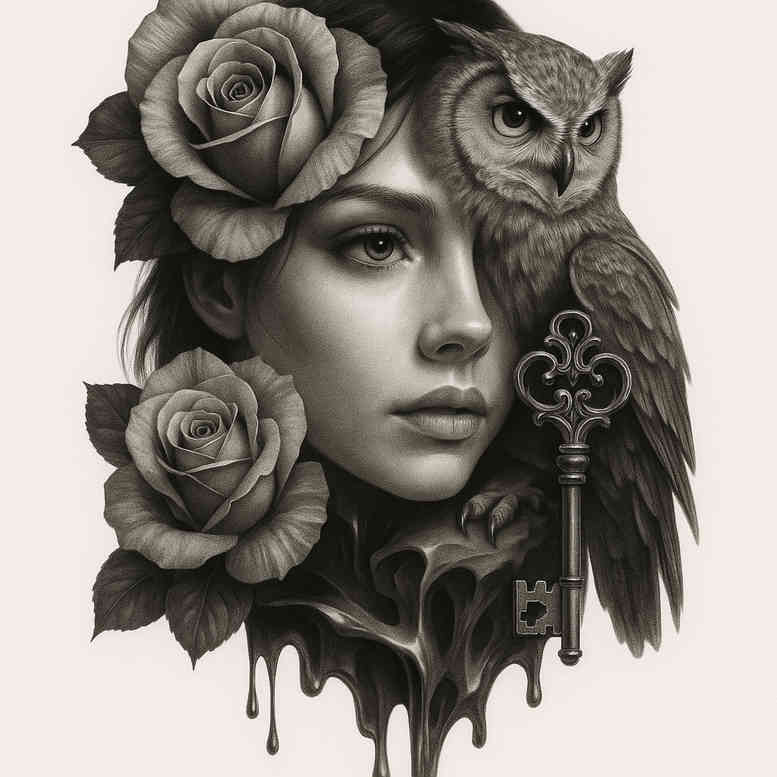 This AI-generated concept explores a contemporary take on Anubis-inspired symbolism, blending a lifelike black and grey portrait with floral and symbolic accents. The composition centers on a woman’s head-and-shoulders portrait rendered in grayscale, framed by two lush roses and a watchful owl perched above, adding wisdom and nocturnal transition. A stylized key rests near the temple area, hinting at memory, access to hidden knowledge, and a gateway to the afterlife. A dripping ink motif pools at the base, merging realism with surreal gravity and inviting the eye to travel from life to form to shadow. The piece uses soft transitions and fine line shading to render skin texture, feather detail, and petal veining without harsh outlines, producing a sense of weight and atmosphere. In line with meaningful tattoos and the broader tattoo-design lexicon, the imagery speaks to life, death, and remembrance, echoing themes central to Egyptian myth and the role of Anubis as guardian of the dead and guide through thresholds. Though not a literal portrait of Anubis, the design channels his protective presence and the idea of transformation, making it a potent statement about courage, memory, and the borders between worlds. The composition favors versatile placement—shoulder blade, upper arm, or chest—where the balance of light and shadow remains legible from multiple angles, and heavy blacks anchor a bold silhouette while lighter grays preserve nuance. For those seeking a meaningful piece, this black and grey tattoo design offers a timeless narrative that can evolve with the wearer’s story. As an AI-generated concept, it fuses classical iconography with contemporary technique, delivering a striking, adaptable work of body art for both new and seasoned collectors.